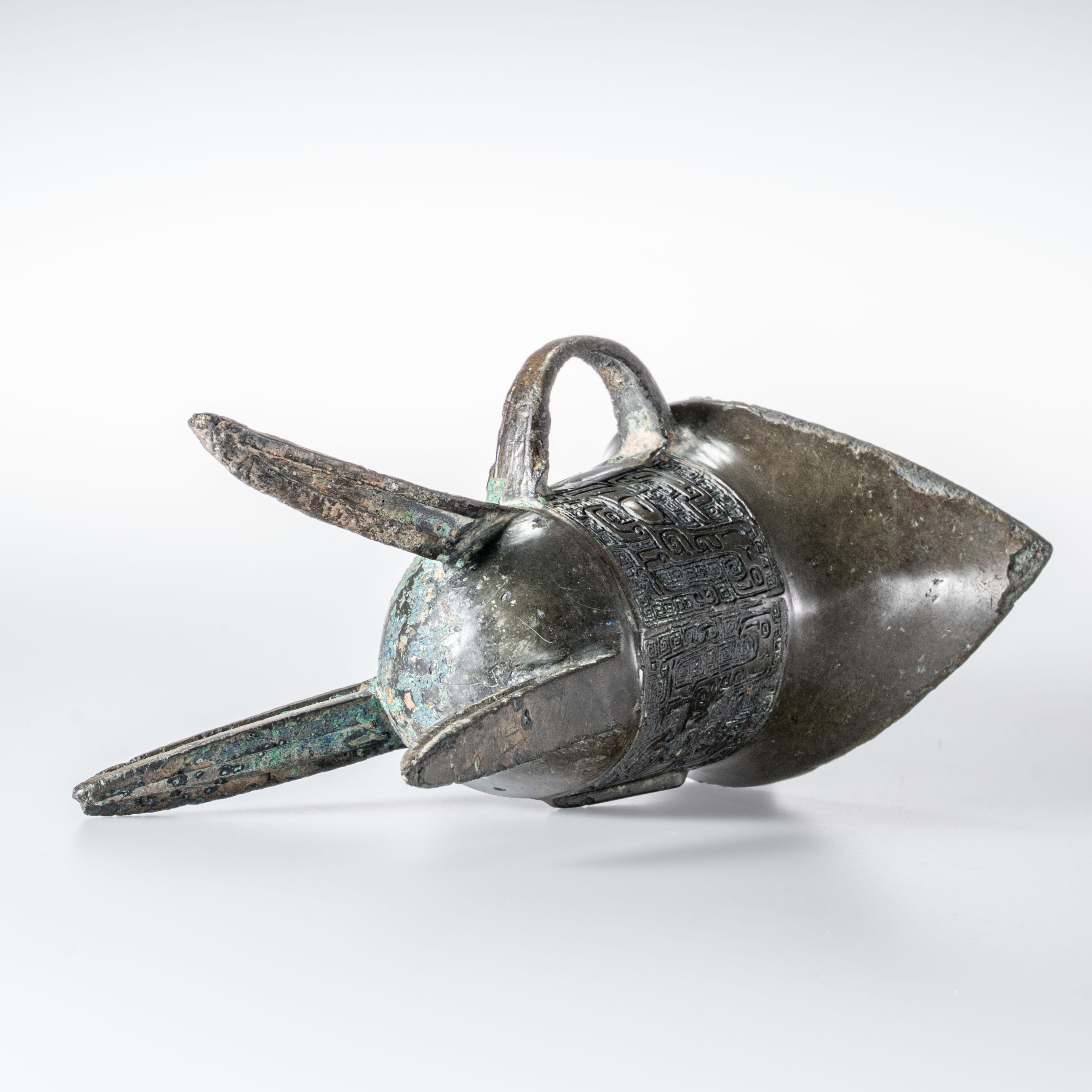 此件青铜爵杯为中国周代典型器物,造型高古挺拔,深腹尖尾,下承三尖足,比例严谨且气韵端庄。器身主体饰以精美的夔龙纹,纹饰深峻清晰,展现了西周时期高超的铸造工艺与礼器美学。历经数千年传承,器表呈现出自然深沉的古铜色泽与入土鏽色,极具沧桑厚重之美。 最为珍贵的是,本品附有日本金工世家秦藏六(二世秦安之)于“丁巳初夏”(1917年)亲笔题写的鉴定木盒。秦藏六家族以精研“周金秦石”著称,是当时日本鉴定中国高古青铜器的权威。他在盒盖长篇题跋中,明确界定此器为“周夔龙纹爵”,并高度讚誉其“造型幽雅,文镂精绝”,感歎其具备“古法”神韵,是一件“寔宝玩器也”。这种由顶级专家背书的“识”字款鉴定,不仅确认了器物的年代与真实性,更体现了其极高的艺术地位。