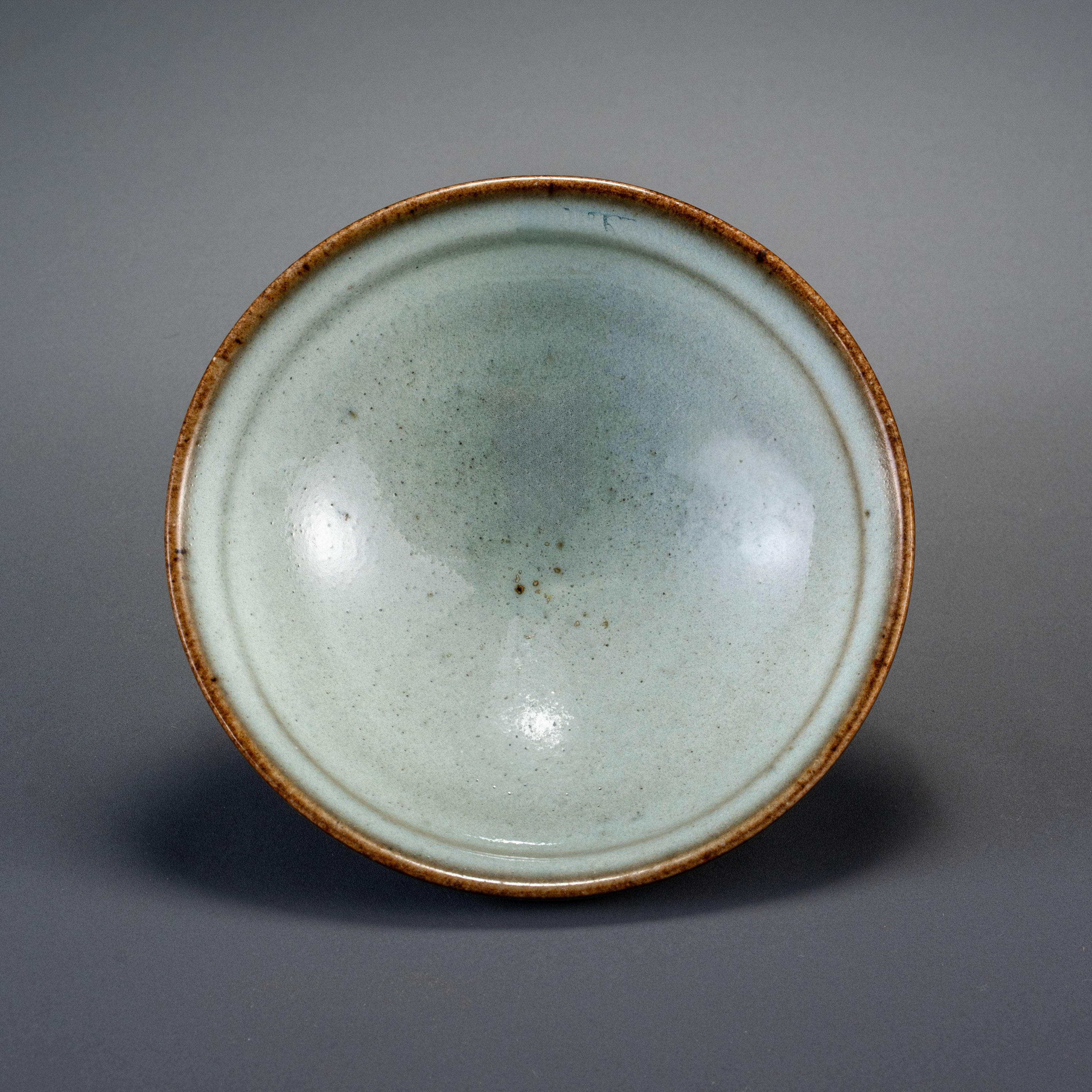 这件宋 钧窑月白釉茶盏完美体现了钧瓷“入窑一彩,出窑万变”的高雅审美。盏型圆润敛口,线条洗练,斜壁弧收,足部修切规整,尽显宋代器物端庄素雅的气韵。通体施月白釉,釉质凝厚酥润,色泽清淡柔和,釉面密佈细小气泡,赋予其如玉般的莹润质感。 此盏造型考究,口沿内侧独特的微凸环线,是借鉴了同时期建窑黑釉盏的“束口”设计,这种结构在点茶盛行的宋代极具实用价值。在击拂茶汤时,束口设计既便于稳固持握,亦能有效减缓茶沫倾溢,使汤花长久紧贴盏壁。此件茶盏将钧窑温润的月白釉色与建窑经典的茶事功能完美融合,不仅是宋代点茶文化的珍贵实物,更是钧瓷艺术中难得的隽永佳作。