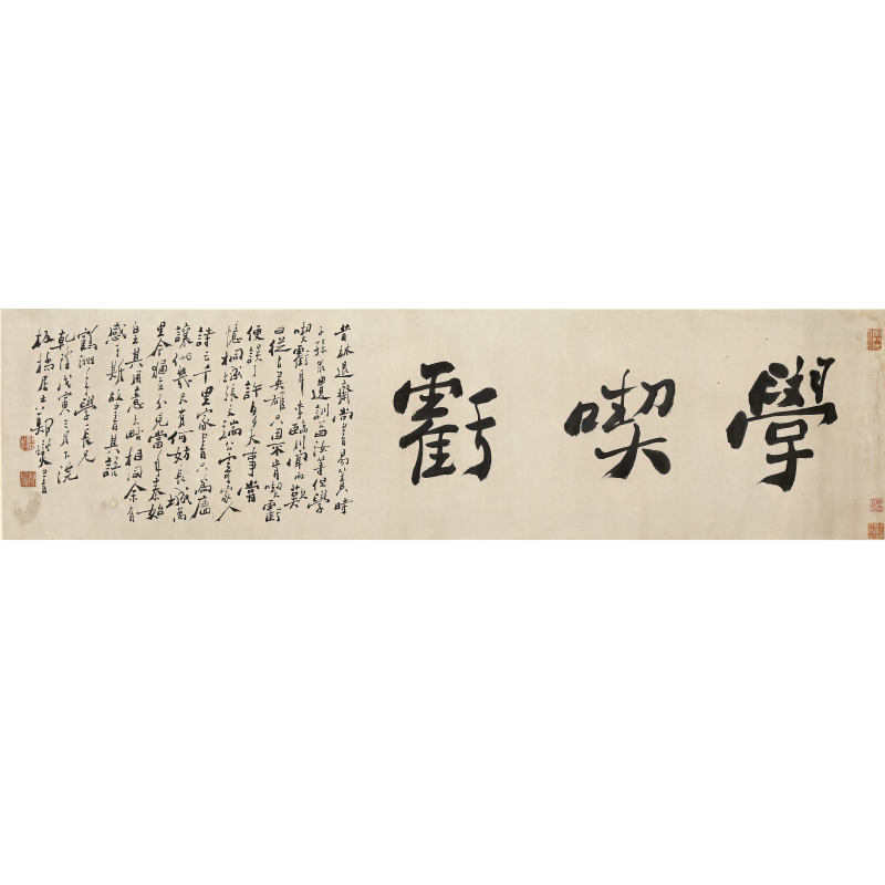 郑板桥(1693-1765),原名郑燮,字克柔,号板桥,江苏兴化人,清代著名书画家、诗人,“扬州八怪”之首领人物。早年家贫,中康熙秀才、雍正举人、乾隆进士,曾任山东范县及潍县知县,为官清正爱民,遇荒年开仓赈灾,深得百姓爱戴。罢官后移居扬州,以卖画为生。其诗、书、画世称“三绝”,尤擅兰、竹、石,创“六分半书”体,融楷、隶、草、篆于一炉,笔势纵横交错,章法如乱石铺街,疏密错落,极富个性与节奏感,影响后世甚钜。 本幅《学砺亏》书法立轴,纸本,水墨,尺寸128×33.5cm。郑板桥以独创之“板桥体”书写,主体右侧三个大字“学碶亏”气势雄浑,笔画粗劲有力,左侧小字款识细緻精谧,形成鲜明对比。整体字形宽窄斜正变化多端,融入画兰竹之笔意,线条挺劲潇洒,佈局参差错落,大小相映,疏处可走马,密处不透风,充分展现其“乱石铺街”之章法特色,体现板桥率真不羁的艺术风格与“难得糊涂”之人生哲思,为其书法精品,弥足珍贵。
