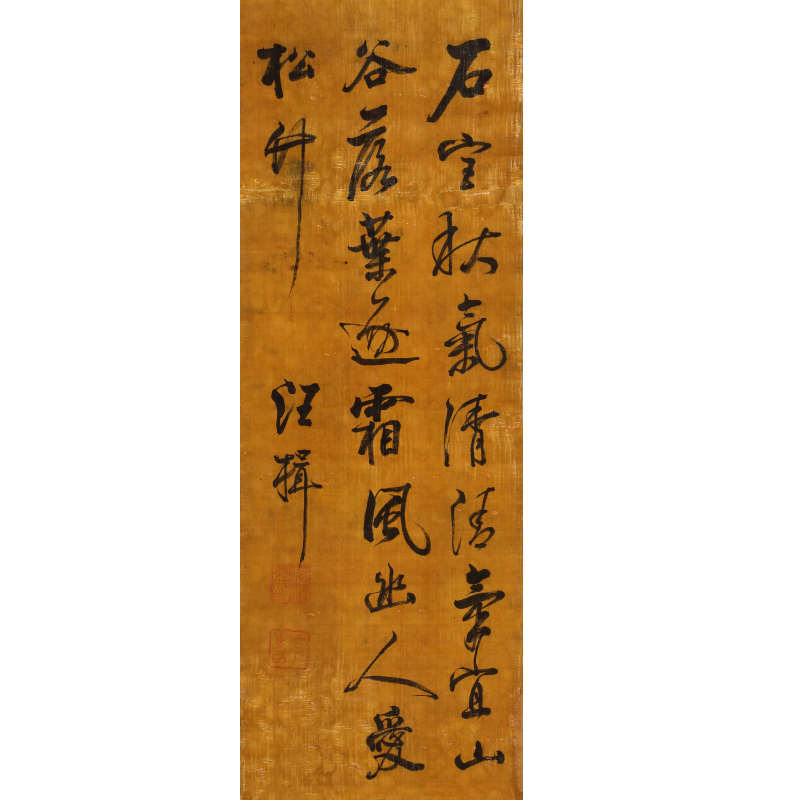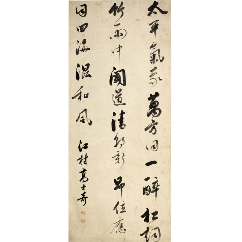 高士奇(1645-1704),字澹人,号瓶庵,又号江村,浙江平湖人,流寓钱塘。清初著名书画家、鑑赏家、诗文家,康熙朝重臣,以布衣入值南书房,官至詹事府詹事,深得圣祖宠信,参与编纂《佩文韵府》、《渊鑑类函》等巨著。书法初学董其昌,后上溯苏轼、米芾,行草尤为精妙,用笔遒劲挺秀,结体疏朗自然,气息清隽高华,风神潇洒,有“南高北王”(与王铎并称)之誉。擅长大字榜书,亦工小楷,其书风影响清代中叶书坛极深,传世墨迹多为对联、条幅、扇面等,深受藏家推崇。本幅《七言书法》,123.7×52.5cm,为高士奇行书力作,书七言诗句(或联语)。通篇用笔沉著痛快,中锋运笔,点画圆劲有力,转折处方圆并用,牵丝映带,行气贯通。结字取势开张,疏密得宜,章法虚实相生,行列错落有致,通幅气息流畅,潇洒出尘。墨色浓淡相间,枯润相映,充分展现其融苏、米、董于一炉之风范,神采奕奕,韵致高古。整幅立轴尺幅宏敞,笔力雄健而意态閒雅,令人玩味无穷,实为高士奇书法中难得之精品佳构。