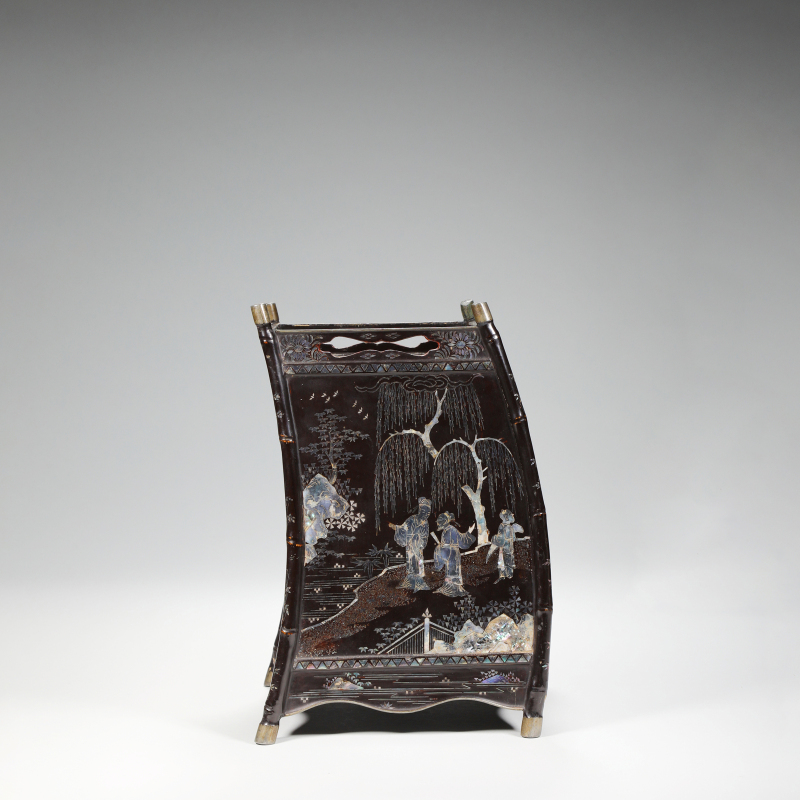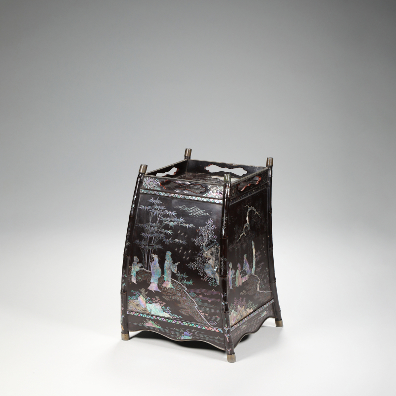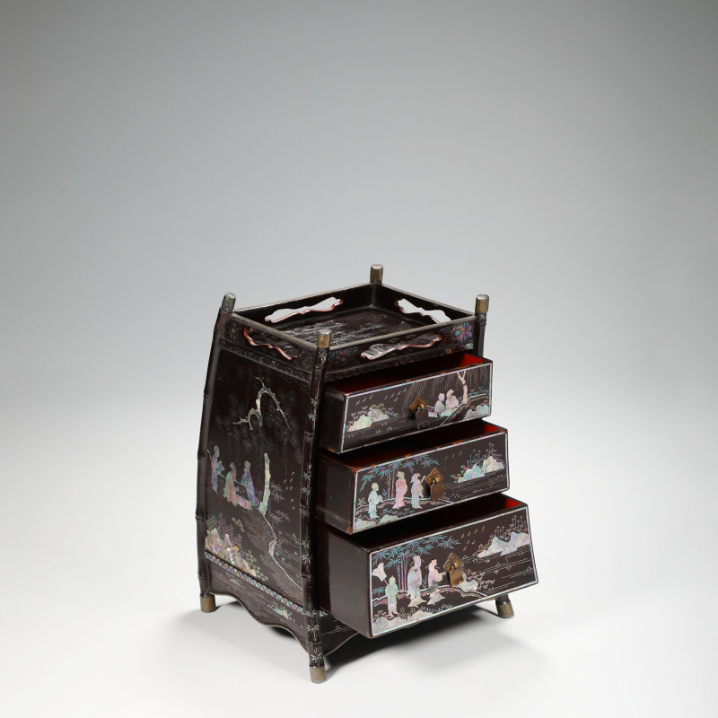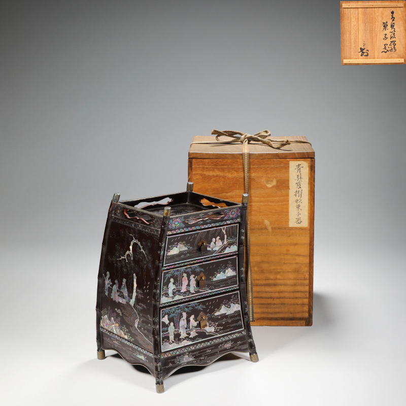 此小柜以黑漆为地,通体髹漆厚实光亮,漆面平滑如镜。四面略外弧,仿竹节形立柱,四角包白铜,顶沿开光如意形透孔,底承白铜蹄足。柜身正面及侧面以青贝螺钿巧妙嵌饰人物游园图:文人雅士于园林中对坐品茗、抚琴、观景,旁植松竹梅菊、柳树飞鸟、山石流水,构图疏密有致,层次丰富。螺钿薄片经精细剪裁,色彩绚丽变幻,随光角度闪烁蓝绿紫诸色,人物衣纹流畅,景物生动,极富诗意。边缘饰几何纹及花卉锦地,工艺细腻华美。整体造型小巧典雅,漆贝相映,尽显文人雅趣与精湛嵌匠,为书斋案头陈设或珍玩收藏之上乘佳作,极具艺术价值。