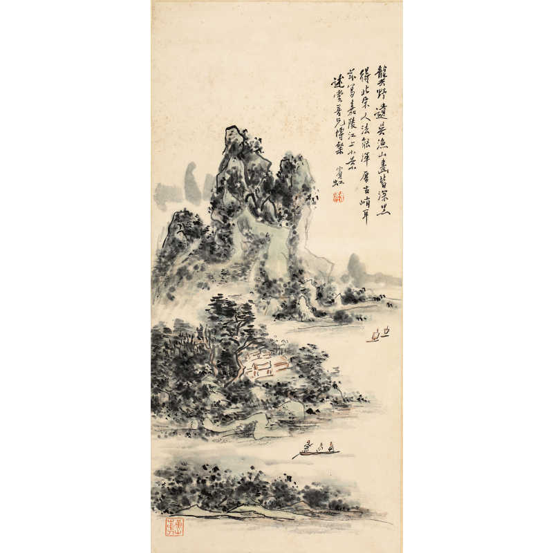 黄质嘉,现代岭南画派重要画家,生于二十世纪初,广东人氏,早年师从岭南画派名家,深受高剑父、高奇峰等先贤影响,融汇中西技法,开创独特风格。黄质嘉擅长山水、花鸟,笔墨酣畅淋漓,设色鲜明活泼,注重写生与生活气息,作品充满时代活力与南方风韵。其艺术成就突出于岭南画派的革新之路,强调“折衷中西,融会古今”,为二十世纪中国画坛注入新意,作品广受藏家青睐,传世不多,极具收藏价值。 本幅《陵江上小景》为黄质嘉山水画之精作,描绘陵江一段宁静景致。画面构图简洁而富有层次,近景江岸坡石苍润,树木葱鬱,中景江水悠然流淌,远山朦胧起伏,云烟缭绕,营造出烟江叠嶂的诗意氛围。笔法刚劲灵动,墨色浓淡相宜,设色清新明快,充分展现画家对南方山水之细腻观察与写生功力。整幅小品虽尺幅不大,却气韵生动,意境深远,寄託文人隐逸山水之情怀,实为黄质嘉山水画中难得之上乘之作。