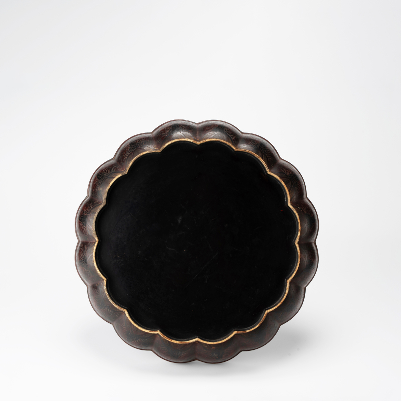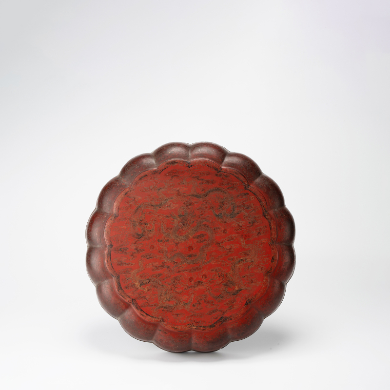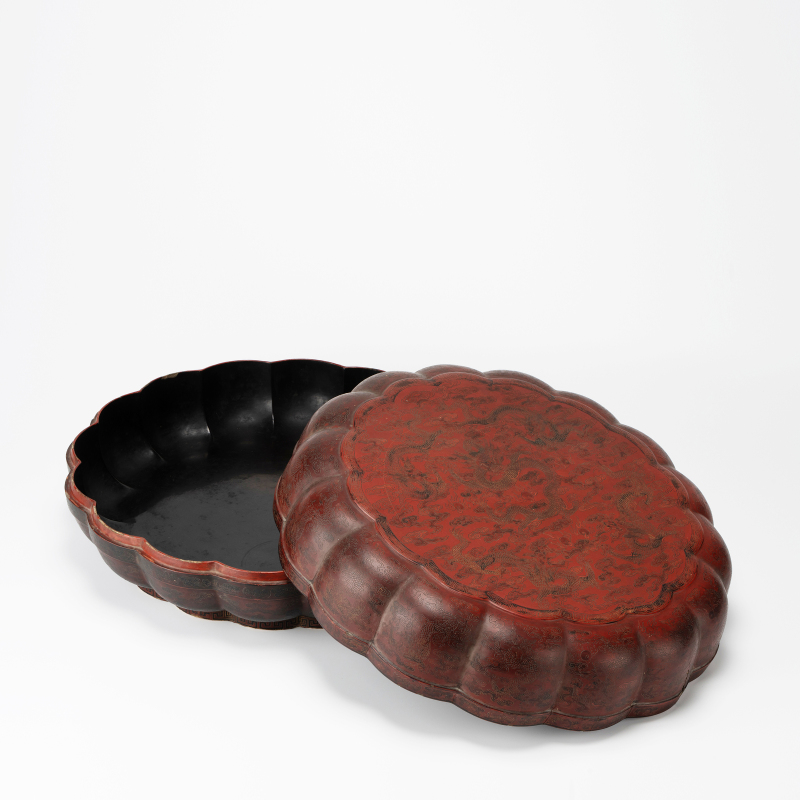 盒作海棠式,子母口,盖面微隆,盒身弧腹下收,圈足。通体髹朱红厚漆,盖面中央雕双龙戏珠,两龙相向腾跃,龙身蜿蜒,鳞甲分明,爪牙张扬,怒目圆睁,火焰珠悬于中间,龙鬚飞扬,气势雄强。外周满饰流云纹,云气翻涌,层次丰富。 盒身壁及盖沿饰海浪纹与如意云头,边缘一周回纹,纹饰繁密精緻,刀工深峻流畅,阴刻线条细若髮丝,层次分明,髹漆肥厚莹润,朱红鲜豔夺目,局部见自然开片,具典型明代嘉靖、万曆时期剔红漆器风格。盒底黑漆,阴刻楷书“存星”二字款。 存星为明代著名漆工,此类署款剔红大盖盒传世稀少,器形硕大,雕工精绝,陈设把玩皆宜,为明代剔红漆器中之重器。