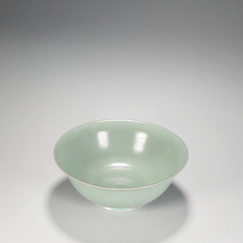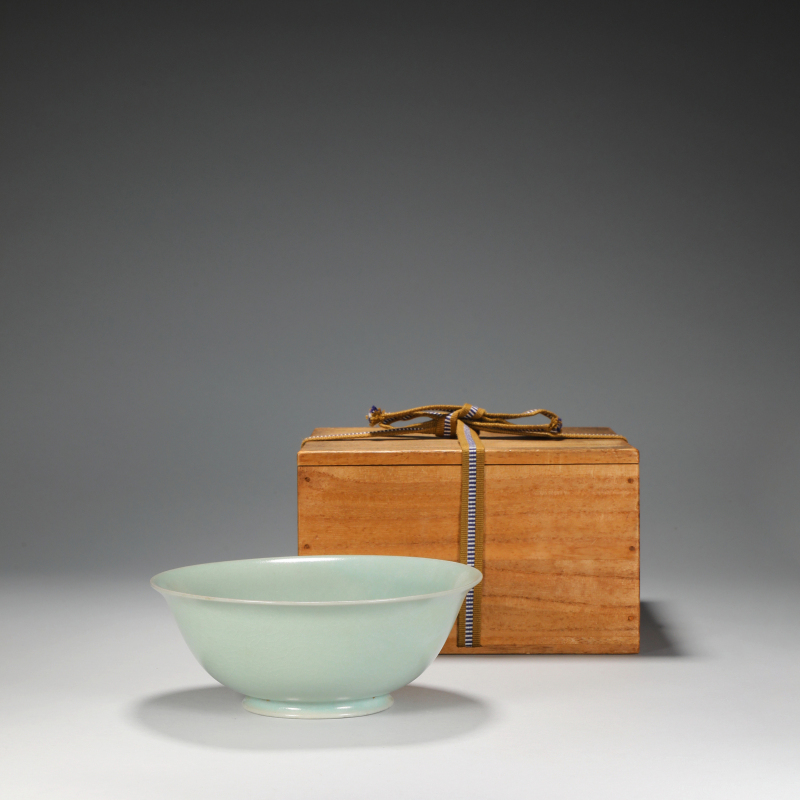 此件青釉鉢造型典雅,口沿微撇,弧腹收束,圈足矮小,比例协调,尽显宋瓷简约之美。通体施淡青釉,釉色温润如玉,釉面光泽柔和,开片细密自然,釉层厚薄均匀,足缘露胎处见淡米黄胎骨,烧成火候精准。内外釉水盈润,静置光下隐现莹润光泽,体现宋代青瓷“雨过天青”之极致意境。附旧木盒,保存完好,古韵盎然,为宋瓷爱好者不可多得之珍玩。