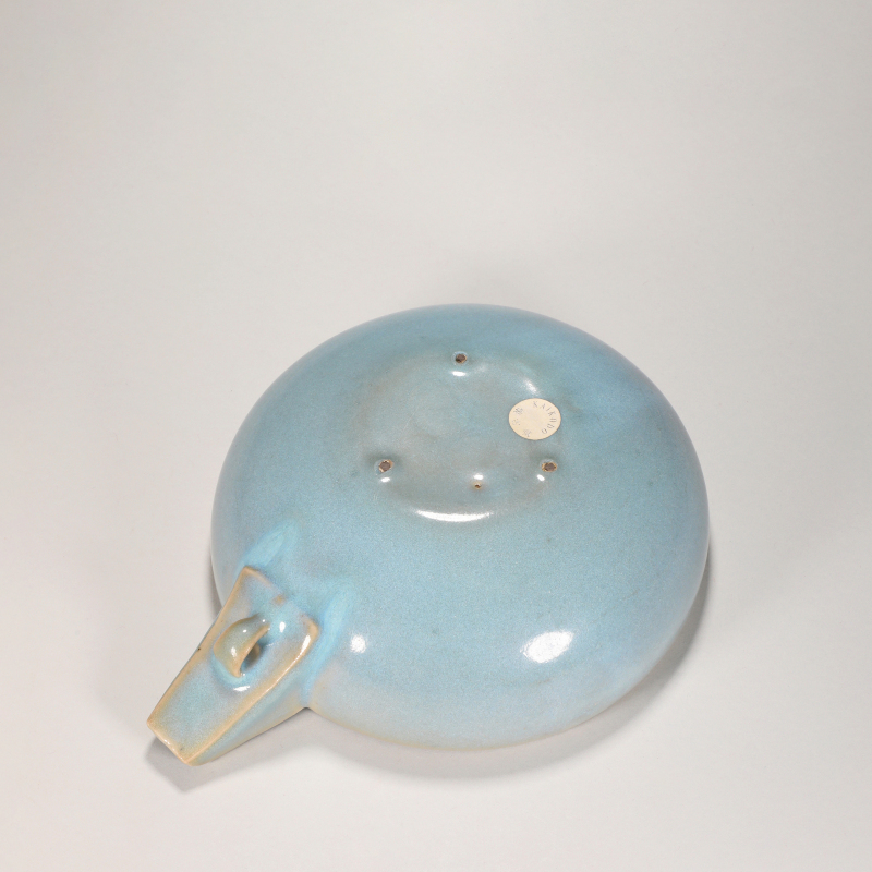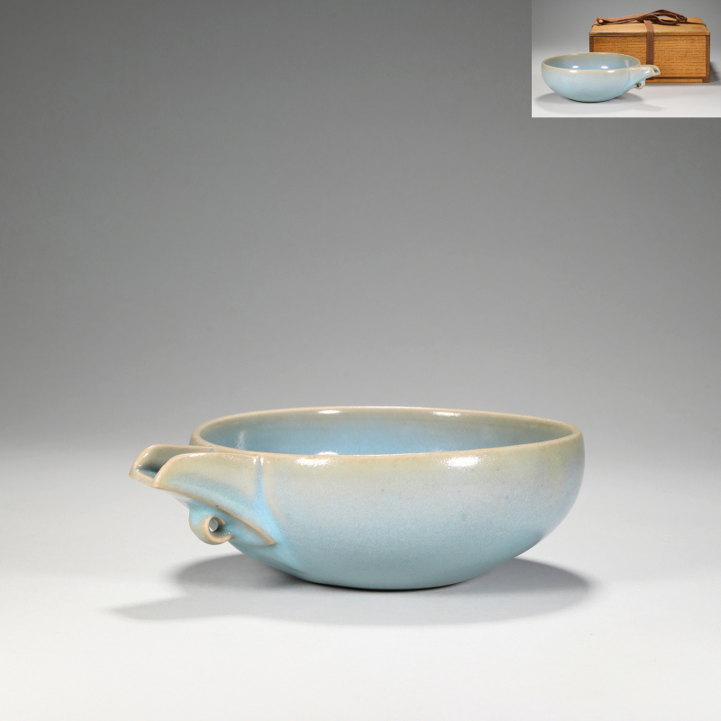 此件钧窑天青釉鉢造型独特,圆口微撇,弧腹深弧,圈足内收,一侧附流把,流口尖翘,把柄弯曲自然,设计巧思,便于倾注,体现宋人实用与审美之兼备。通体施天青釉,釉色纯淨莹润,釉面肥厚滋润,隐现细密开片,釉层厚处色泽深沉,薄处青莹透彻,足底露胎见米黄色胎骨,底有支钉痕迹,烧成工艺精湛。釉水盈润,静观之下宛若天空晴阔,尽得钧瓷“出窑万彩”中天青之极致意境。附旧木盒,保存完好,古韵悠远,为宋代钧窑珍稀器物,极具收藏与研究价值。