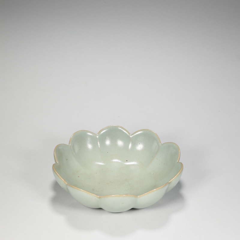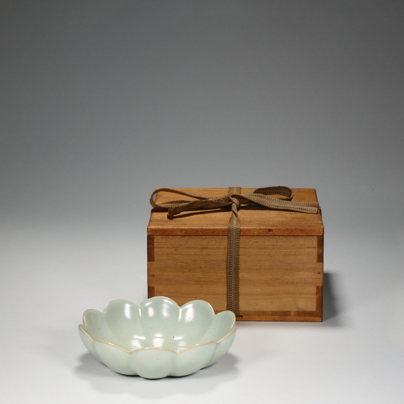 此件青釉花口洗造型别緻,仿莲花绽放之姿,五瓣花口,瓣叶丰满饱满,弧壁内收,圈足矮小,比例和谐优美,尽显宋瓷雅致风韵。通体施淡青釉,釉色莹润如玉,釉面光泽温和,偶见细密开片,釉层匀淨,口沿及足缘露胎处呈米黄色胎骨,烧制精到。内底光素,静观之下釉水盈润,隐现天青意境,实为文房笔洗之上选。附旧木盒,保存完好,古意深厚,为宋代青瓷珍玩中之佳器,值得藏家珍藏。