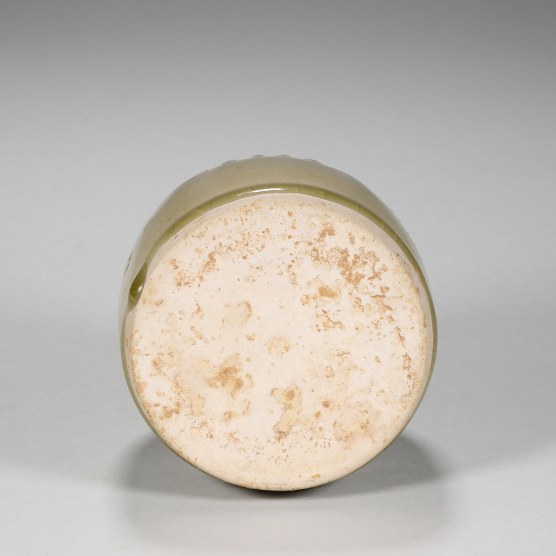 莲花盖香薰,北齐时期典型器形。盖顶中央开圆形出烟口,口缘微收;盖面高浮彫一朵盛开莲花,花心圆凸,花瓣肥硕饱满,层次分明,富有立体感。盖侧以六道直条阴线刻分成六瓣,与莲瓣相呼应,底部再饰一圈连续莲瓣纹。炉身为扁圆鼓腹,下承三乳足,腹下部亦饰一圈莲瓣纹,与盖相应,上下对称。 通体施淡青釉,釉色均匀,开细片自然,釉面温润,带细微土咬及窑渣,露胎处呈浅灰白色。釉层较薄,部分积釉处泛淡青绿色,具明显的北朝青瓷特徵。 北齐青瓷香薰传世极少,此类莲花盖三足小炉尤为典型,多见于河北、河南、山西等地北齐墓葬出土。本品造型端庄,莲花纹饰生动,釉色开片自然,保存完整,为研究北朝佛教艺术与日常用瓷的重要实物资料,亦是北齐青瓷小件中的难得佳器。