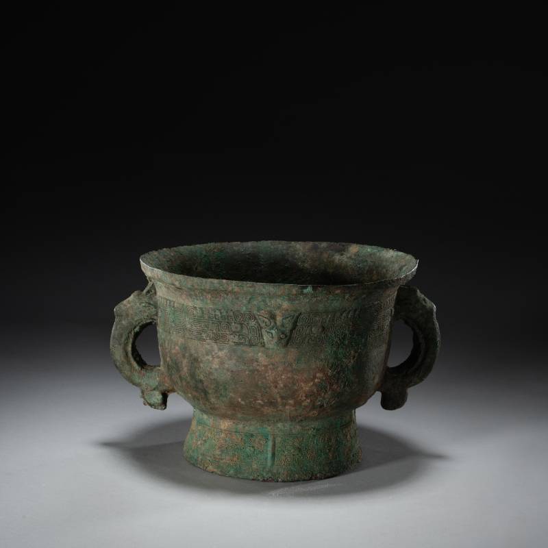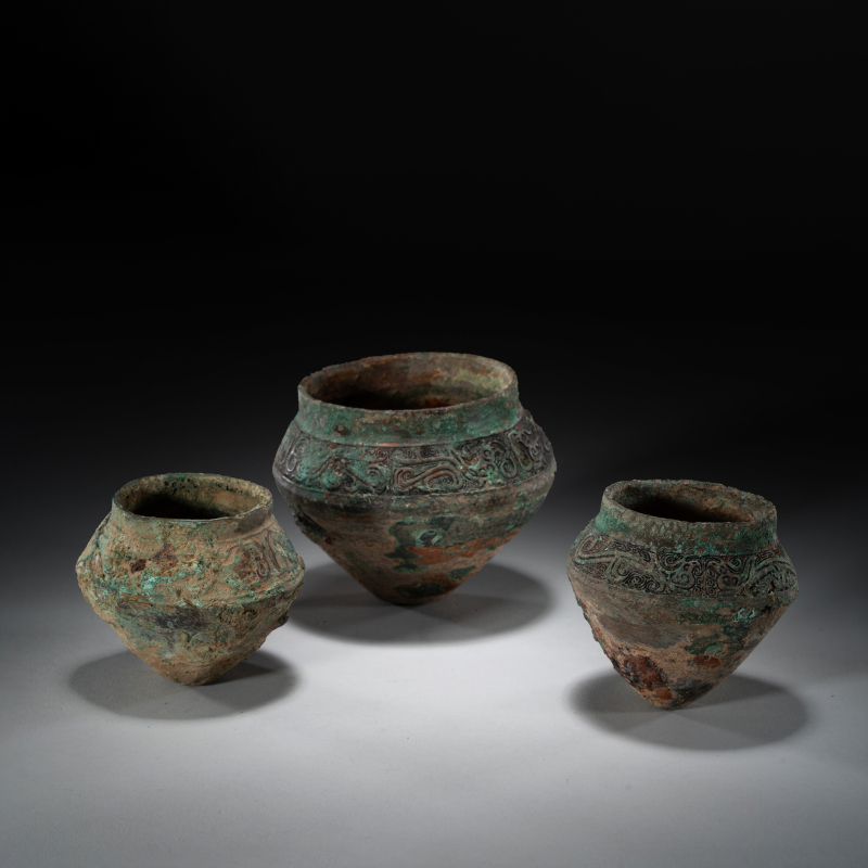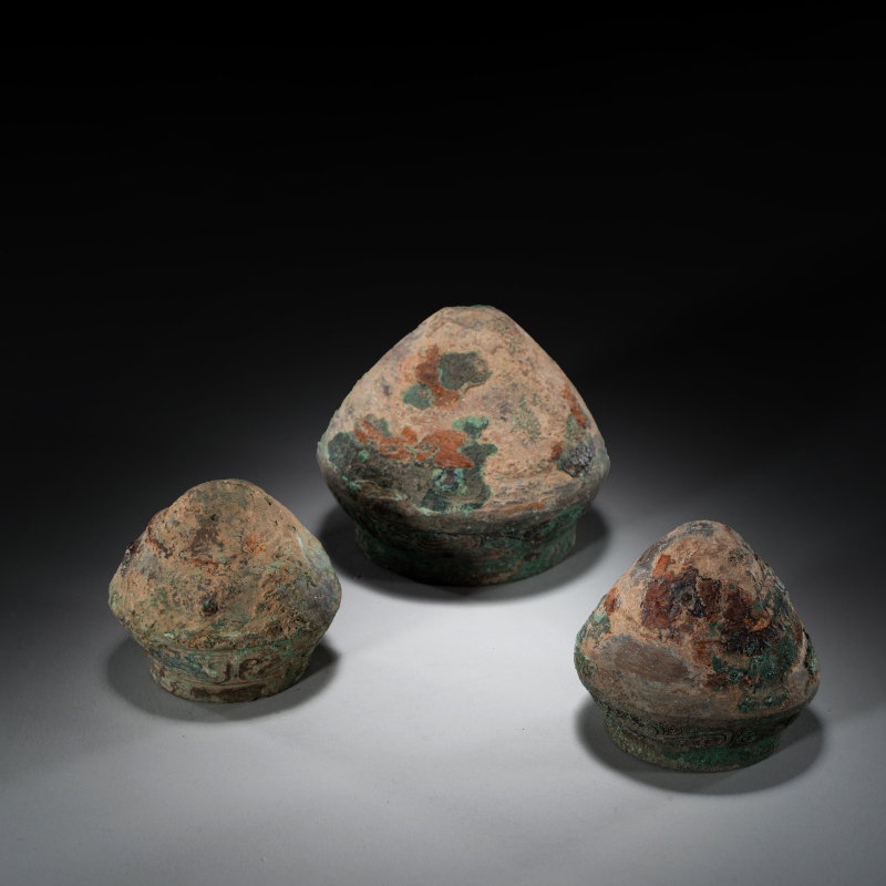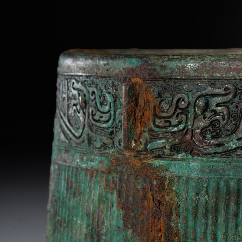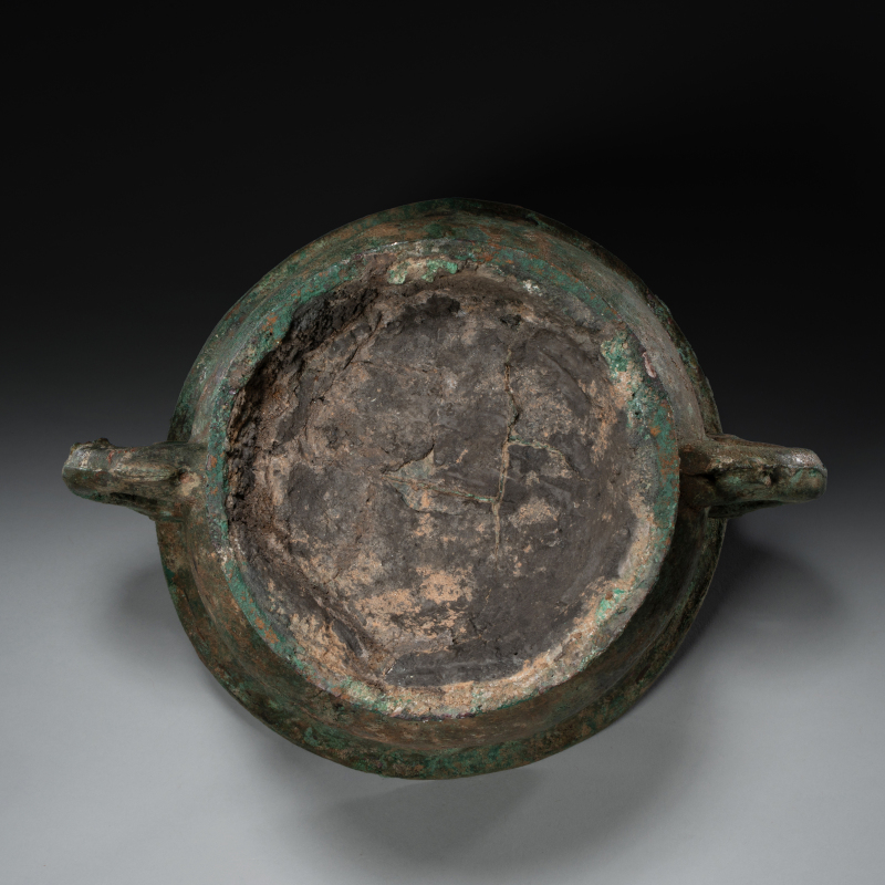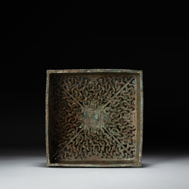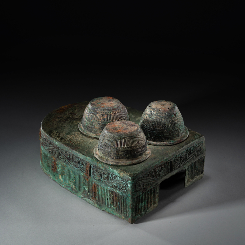 西周(约前1046–前771年)为中国青铜时代之巅峰,周人沿袭商代青铜礼器传统,同时建立更严谨之礼制。青铜器不仅用于祭祀,亦彰显王权与贵族阶层,食器逐渐取代酒器成为主流,体现周人“重食轻酒”之礼乐思想。 本件《青铜灶台》为西周罕见实用炊器,青铜铸造,方形台座上开三个圆形炉孔,附带三件原配炉具(一具倒置陈列)。炉身饰弦纹与饕餮变形纹,边缘饰蟠虺纹,台座四面浮雕兽面纹并配以纵向棱脊,底部设镂空支足。表面覆自然孔雀蓝及朱砂斑鏽皮,包浆厚重古雅,充分展现西周中期青铜器雄健典丽之风格。此类三孔灶台配原装炉具极为难得,或供贵族宴飨时温食之用,反映当时炊煮技术与礼仪生活之精湛。