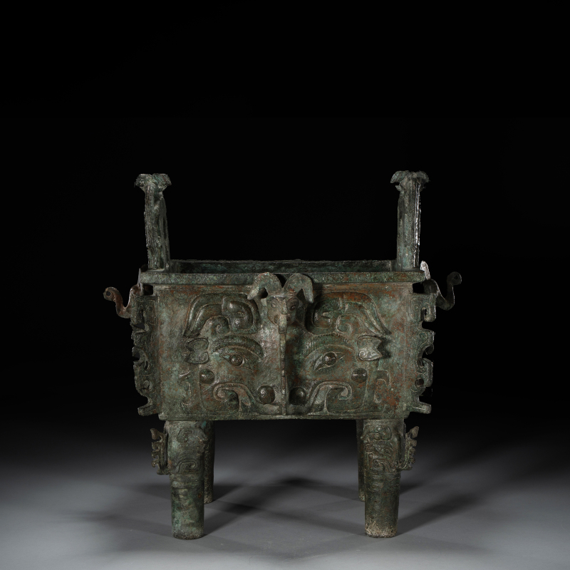 此方鼎为春秋时期青铜礼器典型,器呈长方形,直壁微敛,平底,四柱足,下承四兽首形足。口沿两侧饰对立凤鸟耳,盖顶双兽钮,盖与器身饰高浮雕兽面纹(饕餮纹),以云雷纹为地,纹饰繁缛神秘,线条刚劲有力,充满商周遗风。腹部四面及四隅饰扉棱,强调立体感,柱足上亦饰兽面,工艺精湛。器表覆绿锈斑驳,局部露红褐古铜色,包浆自然厚重,传世品相上乘。春秋青铜器承袭商周兽面传统,然造型更趋实用,纹饰逐渐简化,此鼎保留浓郁饕餮意象,体现礼制过渡期之风貌,为研究春秋青铜铸造与礼器演变之重要实物,极具历史与艺术价值。