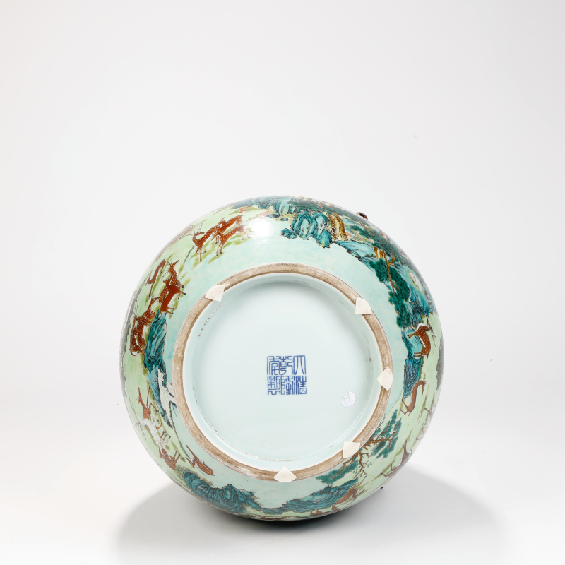 器形硕大雄伟,直口丰肩,鼓腹下敛,圈足。通体以粉绿为地,釉面肥润莹亮,满绘“百鹿图”,百馀头神态各异的鹿或奔或卧,或回首或低头,散布于苍松、古柏、溪流、山石之间,层峦叠岭,云气缭绕,宛若置身仙山福地。鹿身以矾红、赭石点染,斑纹清晰;松树以墨彩与石绿层层渲染,针叶分明,极富立体感;山石以孔雀绿、淡青晕染,层次丰富,尽显乾隆朝粉彩“过枝”技法的精妙。 肩部塑贴双鹿首耳,耳作褐釉,造型生动,与通体主题相呼应。圈足内施白釉,无款。 此尊体量宏大(口径逾41 cm,高50 cm),画面繁密而井然有序,色彩妍丽明快,粉质感强烈,充分展现乾隆御窑粉彩的最高水准,为“百鹿尊”经典器型中的大器,传世完整者已属罕见,极具陈设气势与收藏价值。