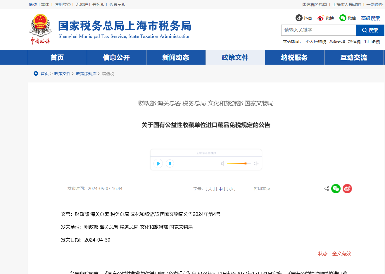 税收方面同样迎来具体支持。根据财政部、海关总署、税务总局联合发布的公告,2024年至2027年期间,国有公益性收藏单位进口藏品免征进口关税和进口环节增值税,显著降低了海外文物艺术品的回流成本。