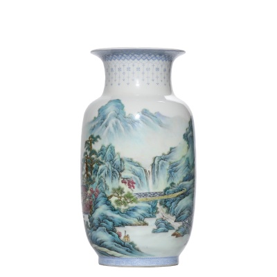 瓶身通景绘青绿山水,层峦叠嶂间云雾缭绕,飞瀑流泉与苍松茂柏相映成趣,小径蜿蜒处有人物策杖而行,意境悠远。设色以浅蓝、石绿为主,兼施淡粉、赭石,色彩明快雅致,笔触细腻工致,尽现张志汤笔下 “山水清润、气韵生动” 的艺术特点。