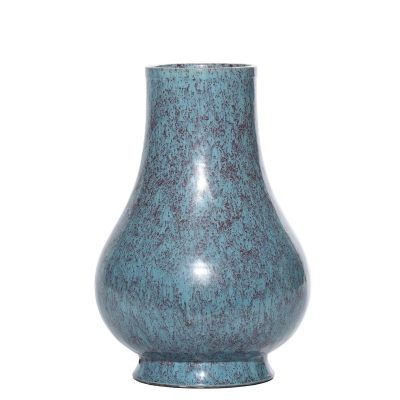 瓶身通施炉均釉,釉面呈现出独特的蓝、紫交融的斑驳效果,青蓝釉色中密布紫红色斑点,如繁星洒落,釉色流动自然,变幻莫测,尽显雍正朝炉均釉 “红蓝相间、熔融垂流” 的典型特征。釉面莹润光亮,开片细密,触感平滑温润,为雍正单色釉瓷中的上乘之作。