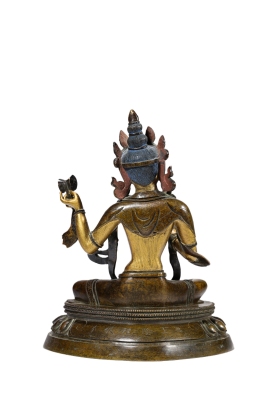 佛像以精铜铸造,局部鎏金,金水厚重饱满,历经岁月仍闪耀华贵光泽。造像头戴宝冠,面容慈悲含笑,双目微垂,神态静谧祥和。躯体比例匀称,璎珞、钏环等装饰精美细致,衣纹流畅自然,尽显皇家造像的雍容华贵与精湛工艺。