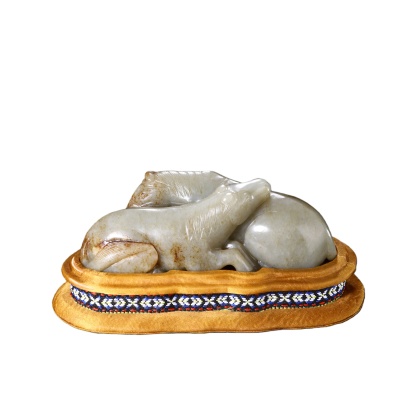整器雕工精湛,线条圆润流畅,既保留了玉料的天然质感,又通过细腻的刻画展现出马匹的灵动姿态,为清代宫廷玉雕的上乘之作。原配织锦座垫,工艺考究,与玉质摆件相得益彰,尽显皇家器物的华贵气质。