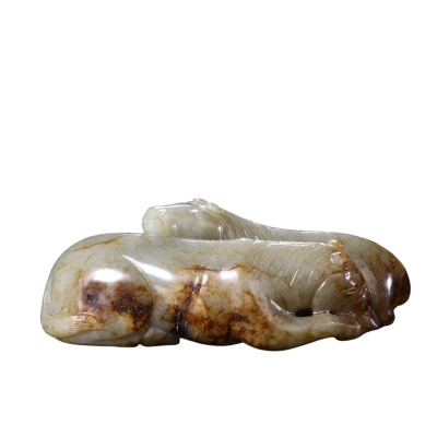 圆雕双马相依而卧,造型饱满写实,马鬃纹理清晰流畅,双目传神,神态安详温顺,寓意 “马上封侯”“马到成功”,兼具吉祥寓意与文人雅趣。双马口衔灵芝,更添祥瑞之意,是乾隆时期玉雕 “图必有意,意必吉祥” 的典型体现。