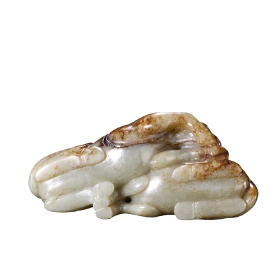 本品为清代乾隆年间宫廷风格的青白玉雕摆件,精选质地温润的青白玉为材,局部带天然洒金皮色,玉质细腻莹润,包浆厚重自然。