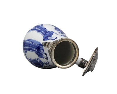 整器瓷质细腻莹润,青花发色浓翠,包银保存完好,兼具实用功能与艺术价值,是研究清代外销瓷与欧洲银器工艺结合的重要标本,流传有绪,极具收藏与学术价值。