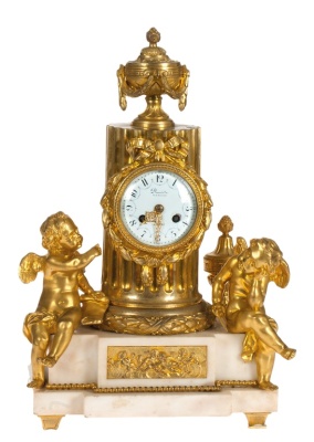钟体为柱式造型,正面镶嵌珐琅表盘,罗马数字时标清晰雅致,指针纤细精巧,机芯保存完好,走时精准。钟体两侧各塑一尊姿态生动的小爱神(丘比特)雕塑,衣纹流畅,神情俏皮,顶部饰以带垂幔装饰的瓮形顶饰,细节繁复精美。基座正面嵌有鎏金浮雕饰板,纹样细腻,与整体风格呼应。
