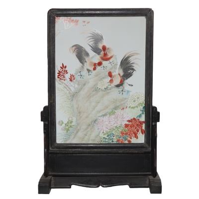瓷板嵌于原配红木插屏座,木座线条简洁稳重,包浆温润,与瓷板相得益彰。整器画工精湛,构图疏密有致,既保留了金品卿笔下花鸟的灵动神韵,又体现了民国瓷绘的精湛工艺,是一件兼具艺术价值与收藏价值的浅绛彩瓷绘佳作。