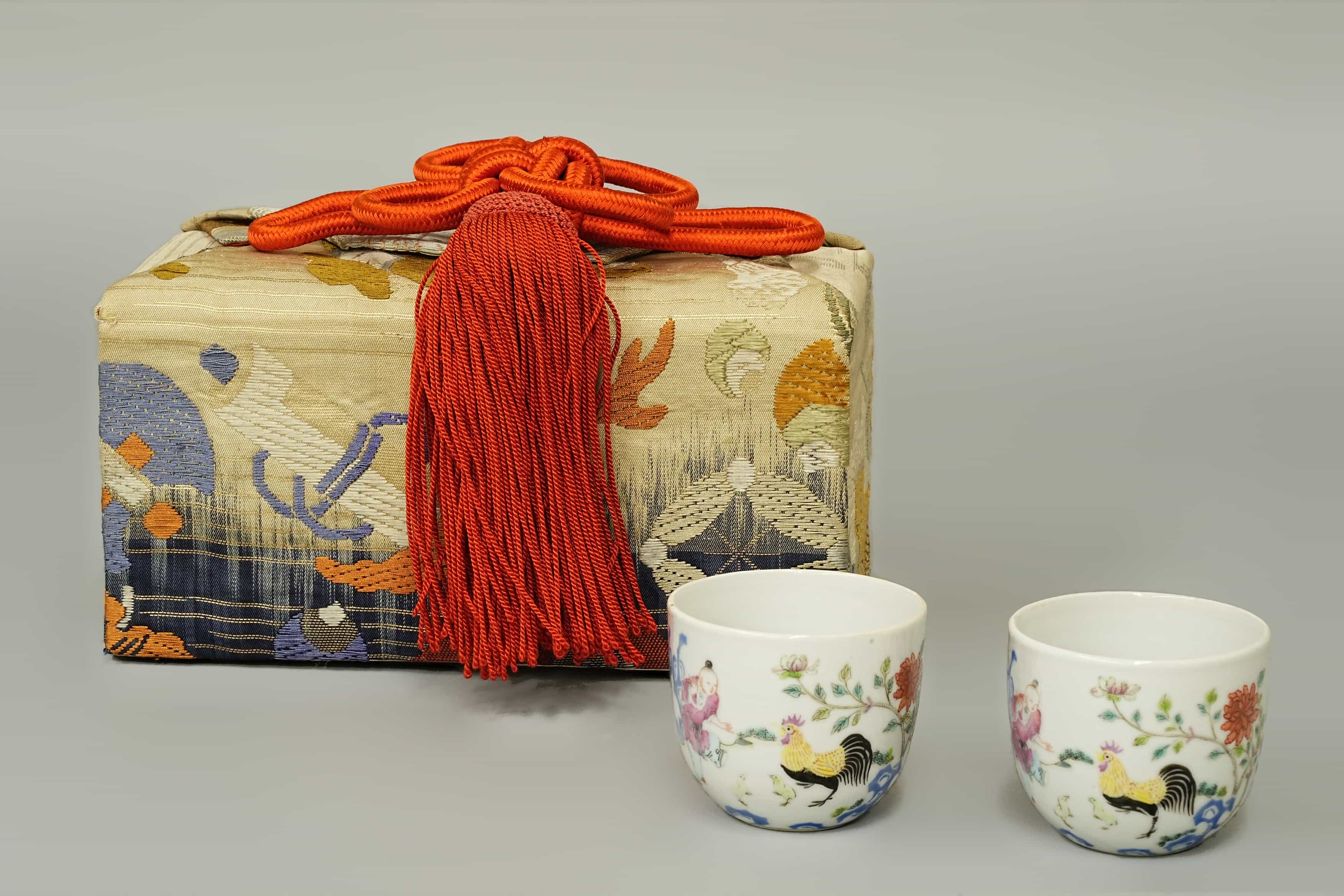 清 大清乾隆仿古 粉彩鸡缸杯一对 日本桐箱附