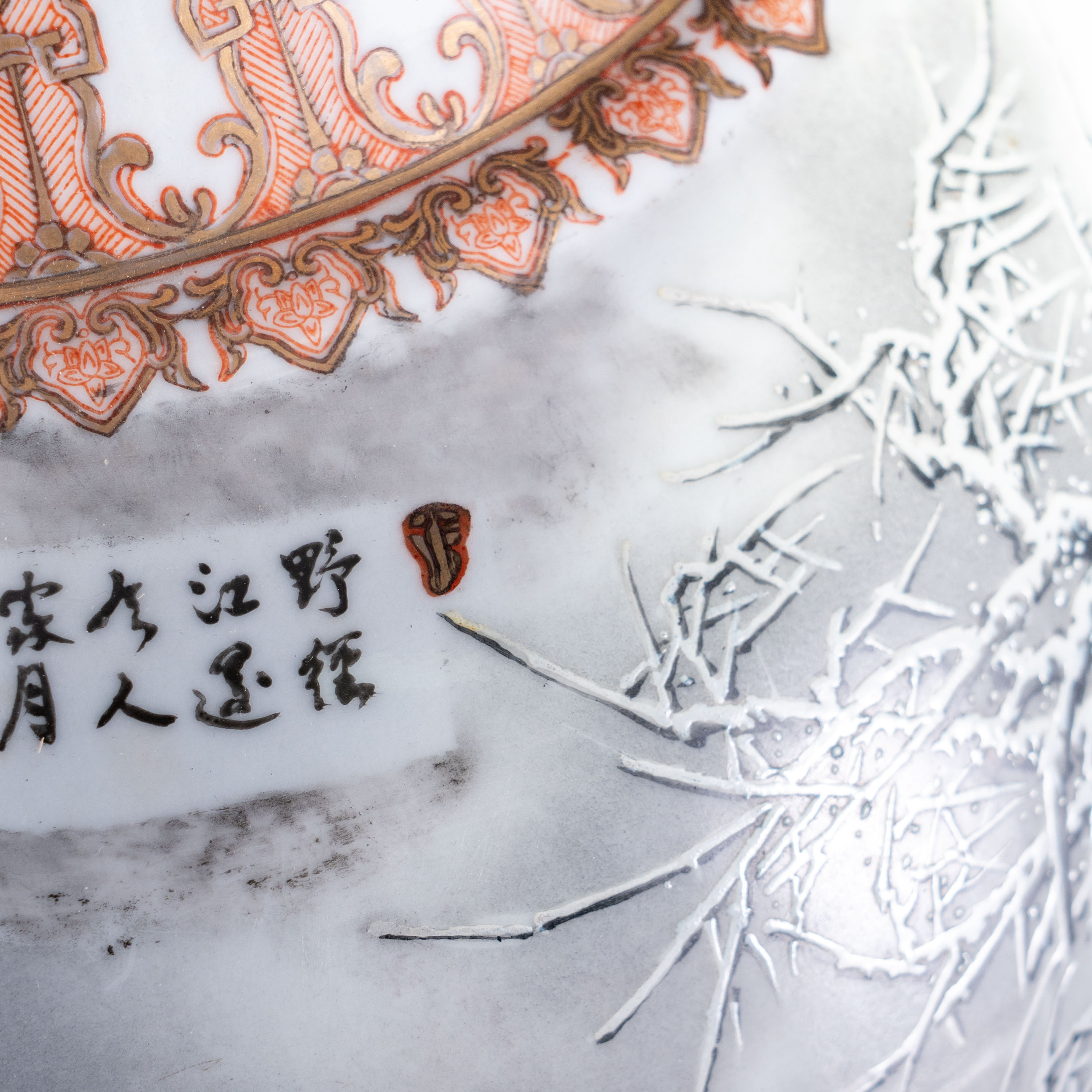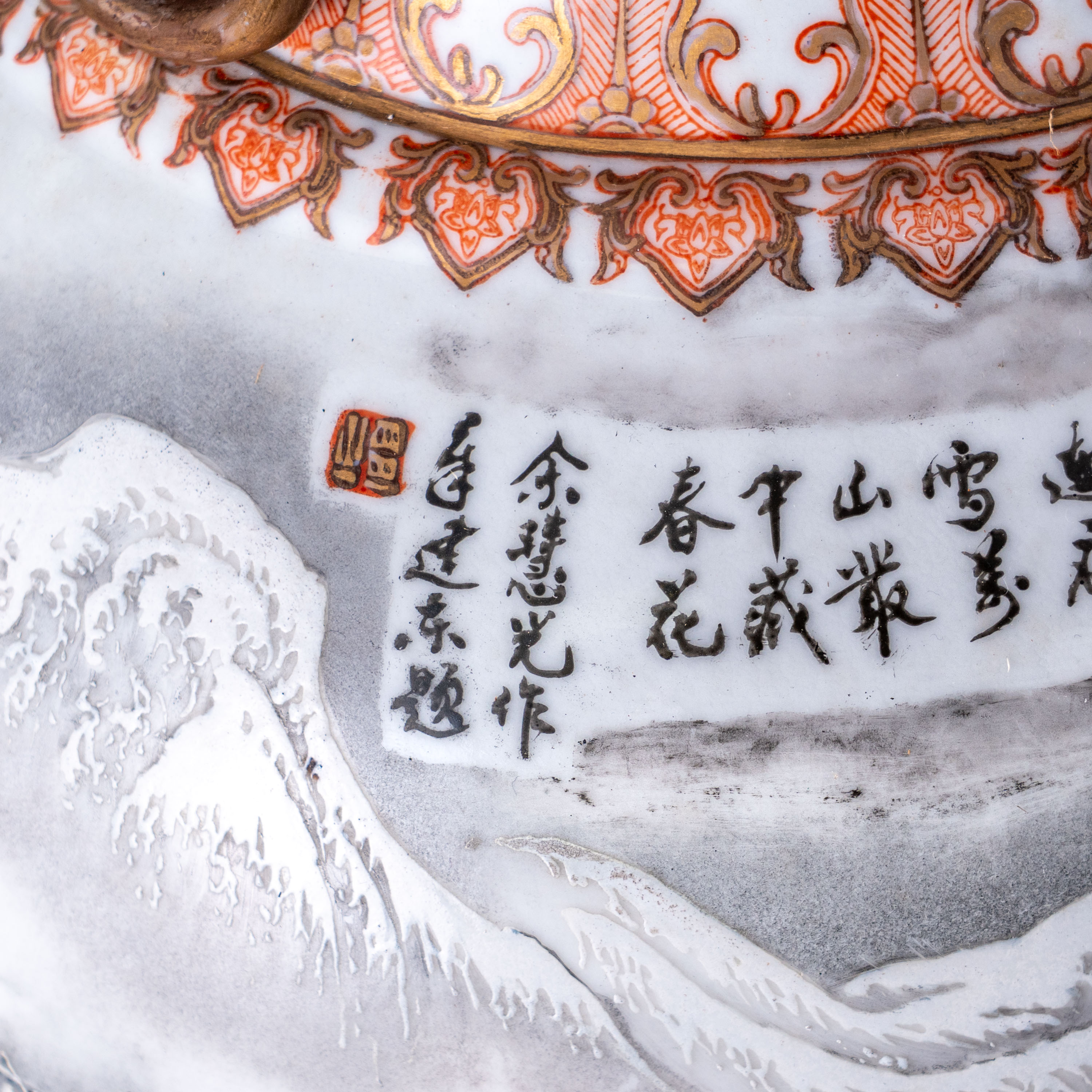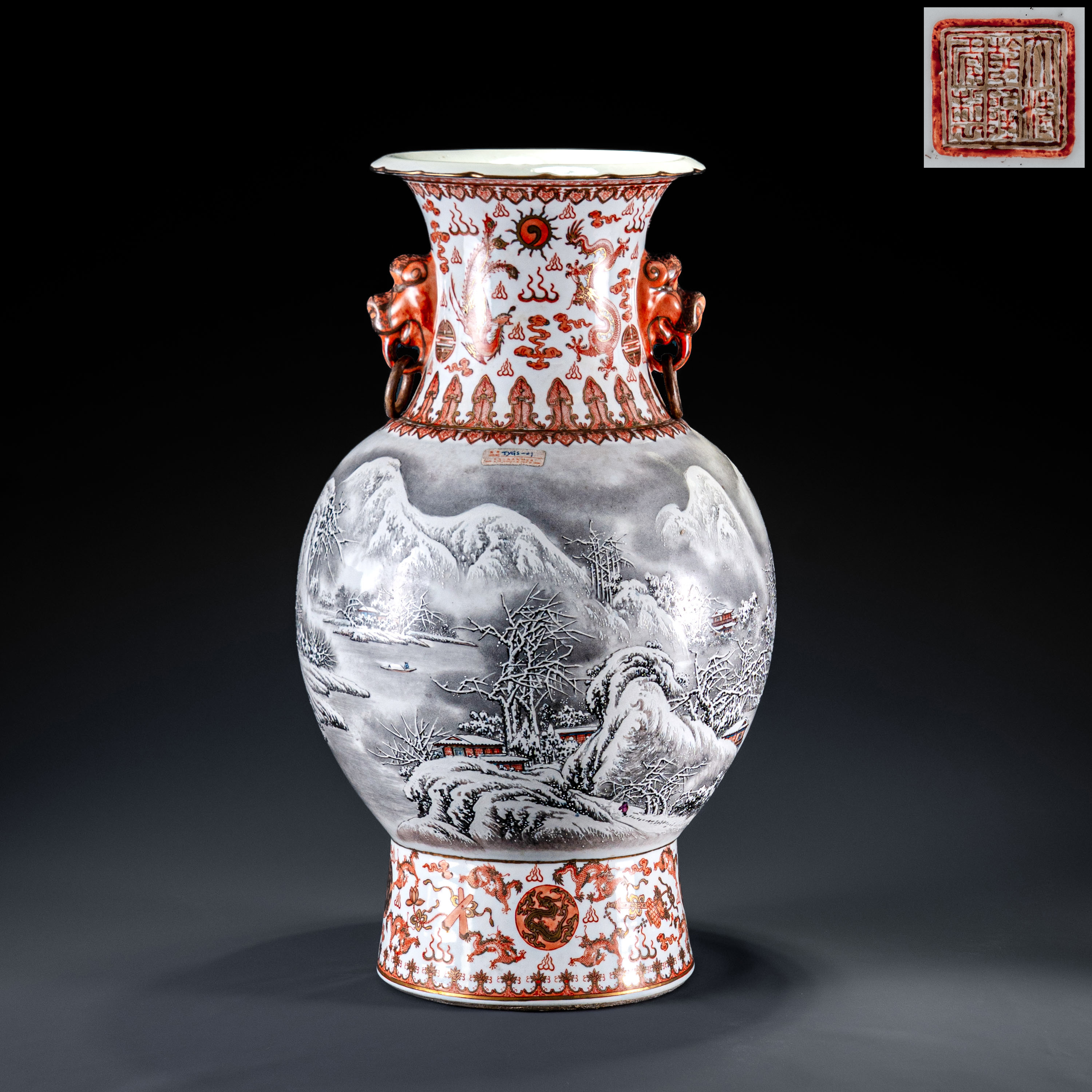 瓶型庄重端稳,撇口长颈,肩部附朱红描金双兽耳,上下饰以精密的龙纹及几何纹边饰,展现了该时期国营瓷厂顶尖的艺术装潢水平。瓶身核心画面由余惠光大师深得其父真传的雪景山水构成。画面以墨彩勾勒,粉彩点染,表现了银装素裹、静谧深远的山川雪韵。笔法苍劲有力,层次分明,对积雪质感的细腻表现尤为传神。瓶身另一侧配有书法工整、意境深远的诗文,文气十足。