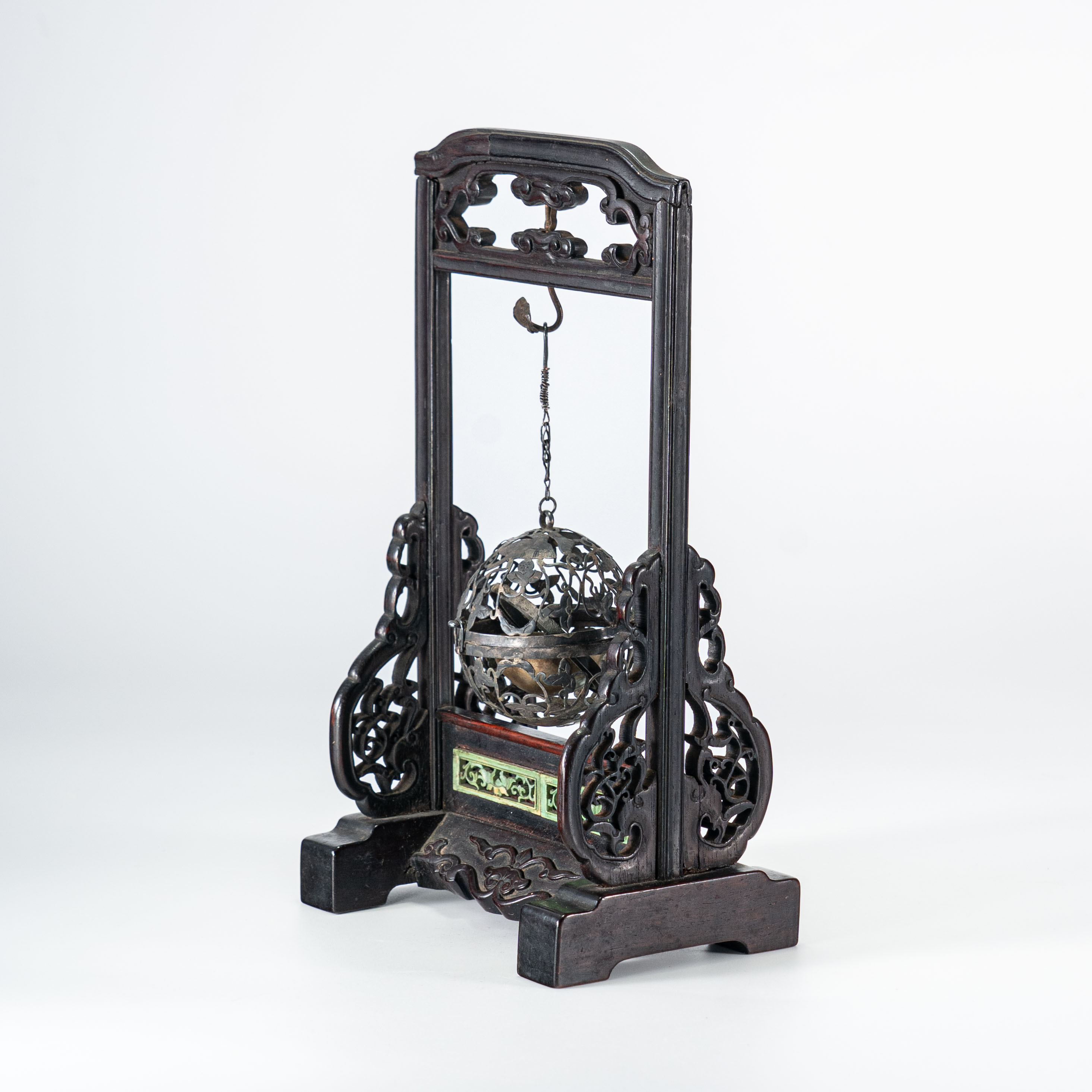 此件香具造型别致,由红木底座与银制镂空熏球合组而成,是清代外销或东渡日本的极高级文房雅玩。底座选用上等红木,木质深沉润泽,包浆自然,散发着古朴肃穆的文人气韵。