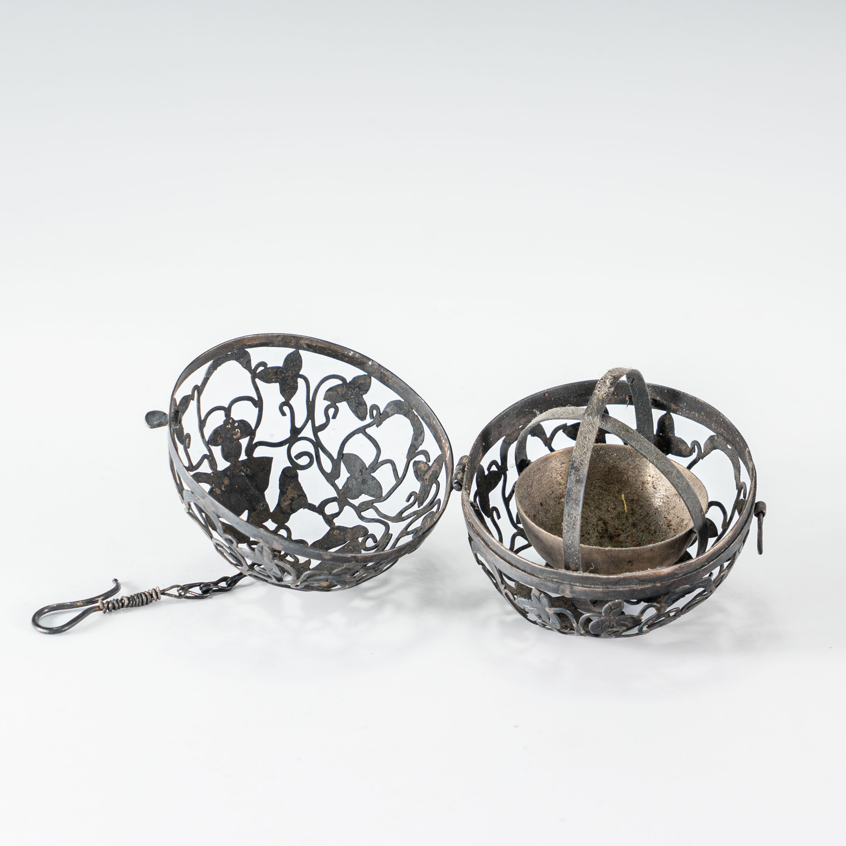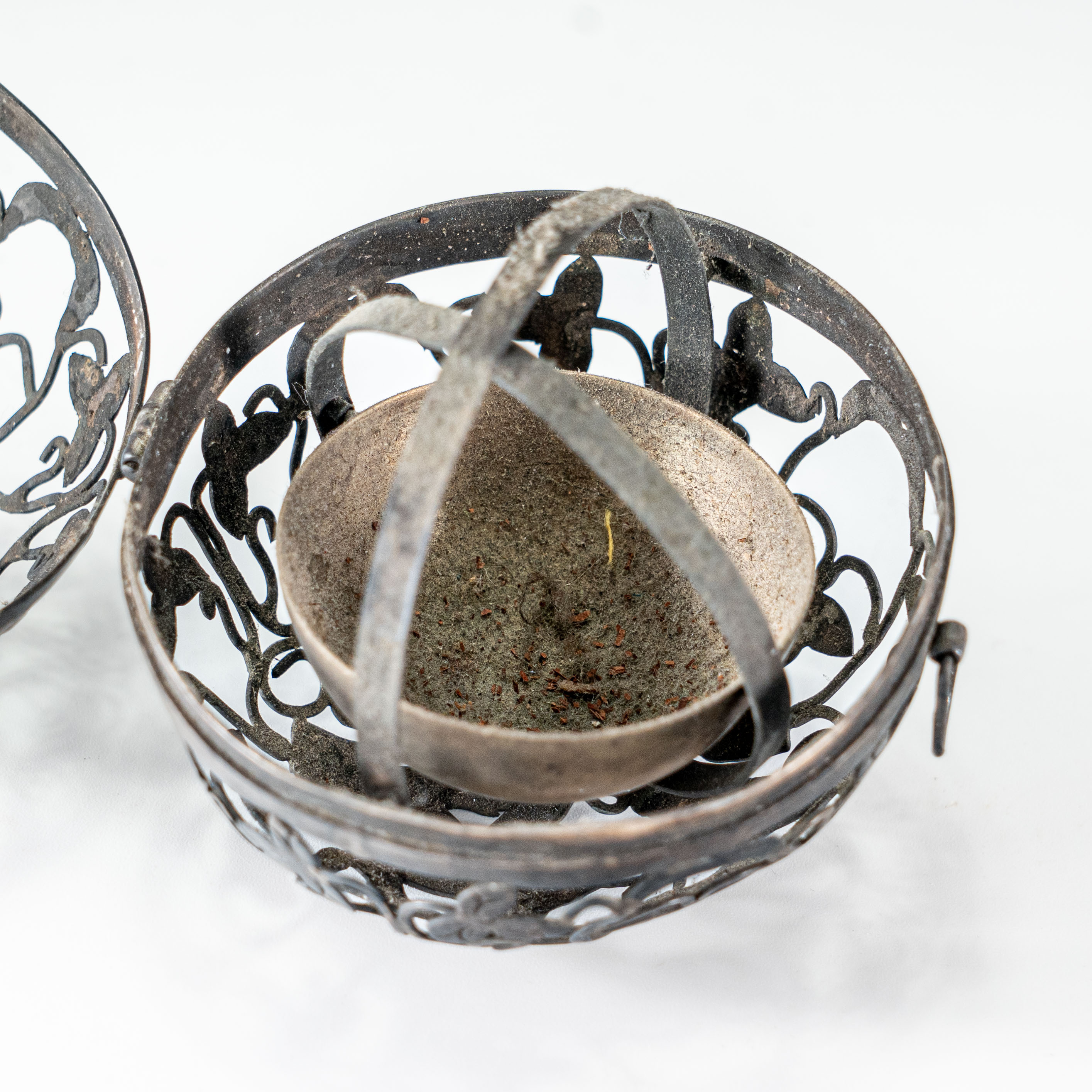 核心部分为银制球形香薰,采用高超的镂空透雕工艺,满绘缠枝莲花鸟纹饰。缠枝莲纹绵延不绝,象征生生不息;花间点缀的禽鸟姿态灵动,细节刻画入微,展现了中国传统金银细工的巅峰水准。球体内部精巧的机械构造(持平环),确保无论外球如何转动,内里的香盂始终保持水平,极具科学巧思与趣味性。