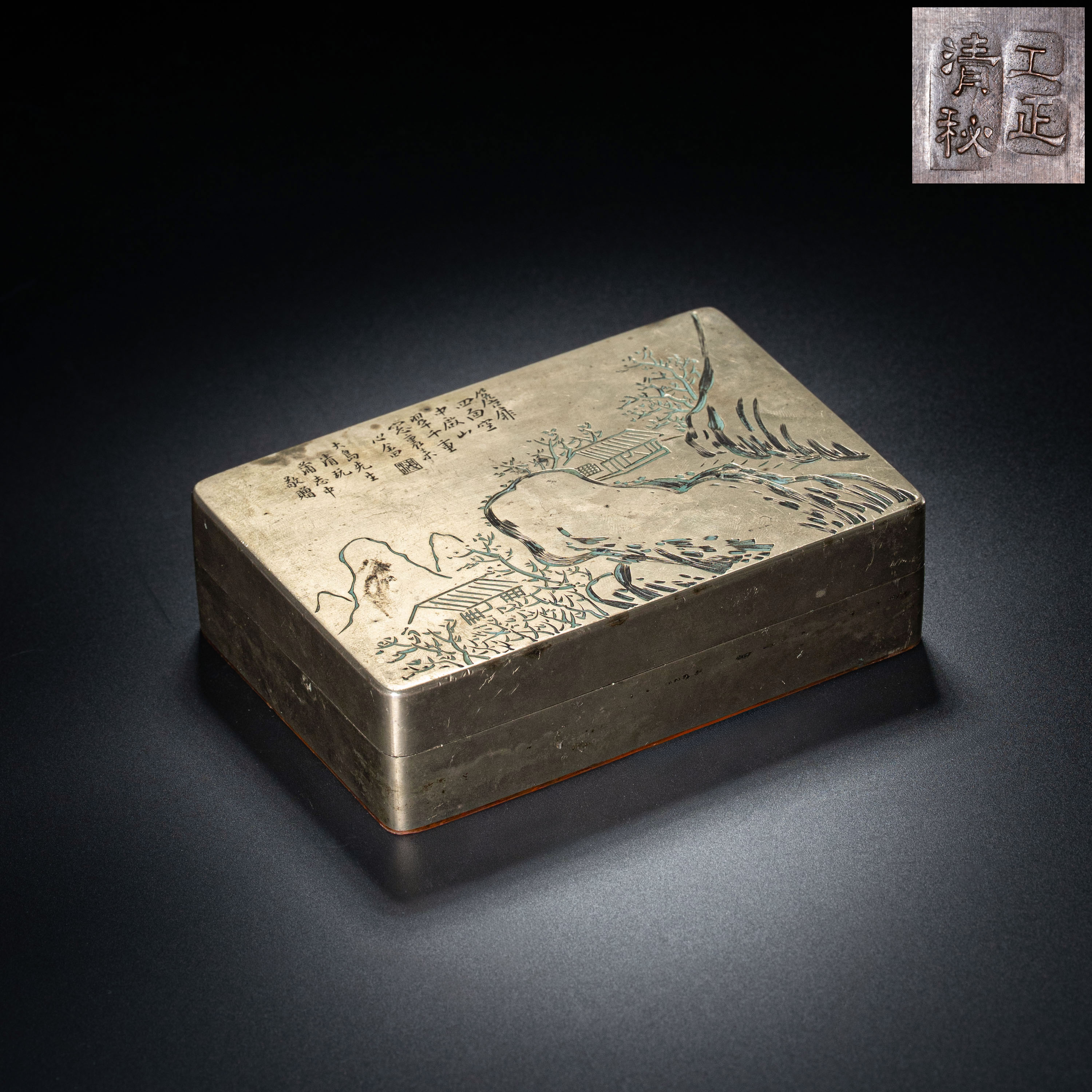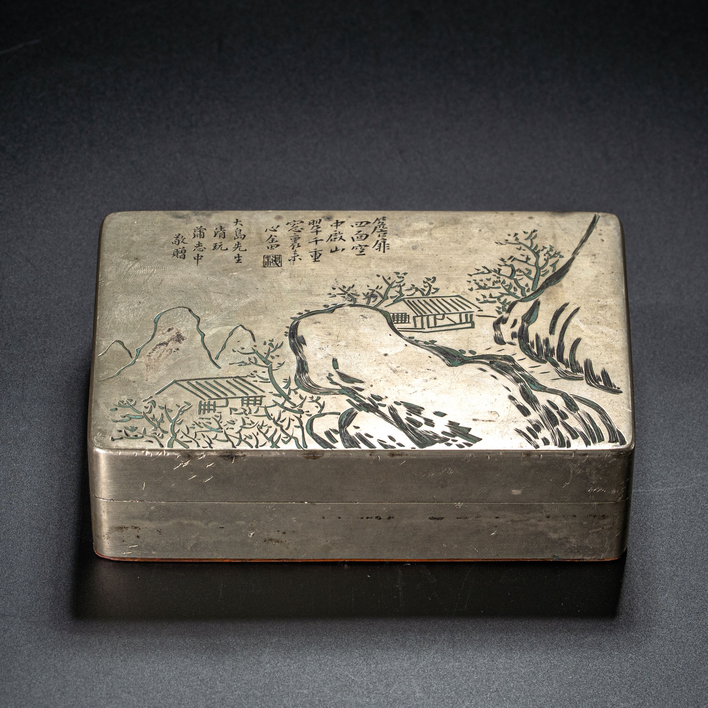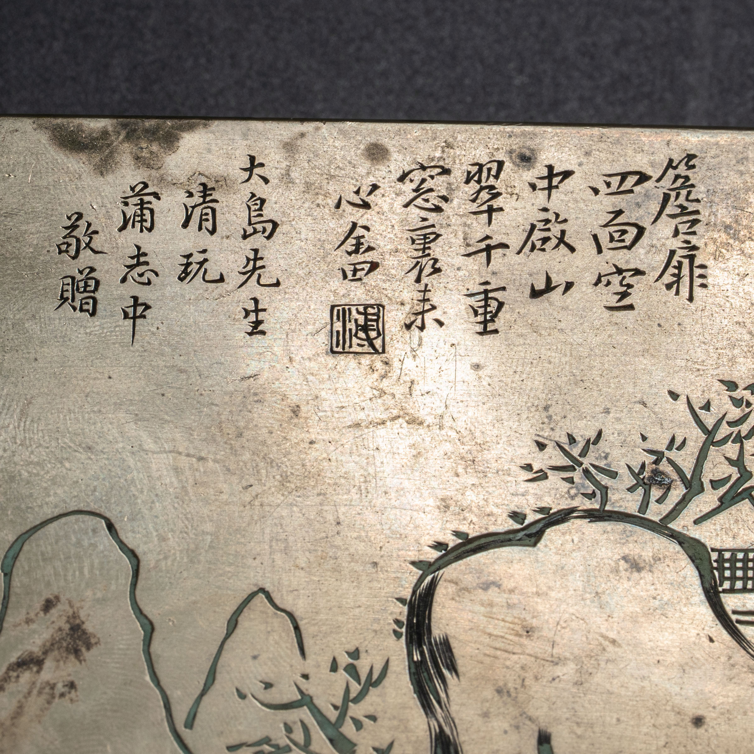 ●Lot 092 清秘阁制 溥心畬赠大岛雅男刻铜墨水匣:溥心畬赠予其日本经纪人之礼,集名家画稿、名店精工于一身,且底款“工正”为罕见孤例。