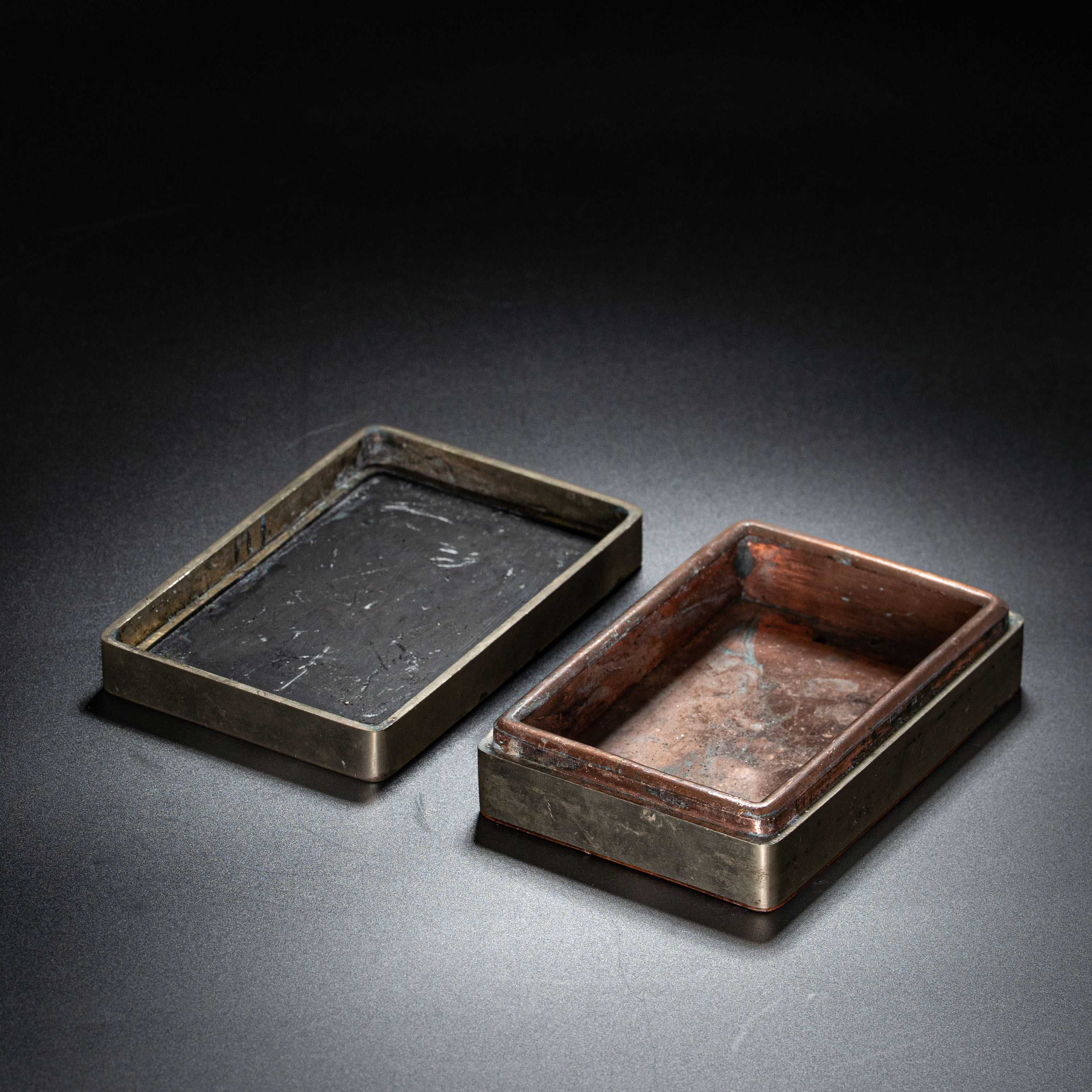 此件刻铜墨盒不仅是民国刻铜工艺的巅峰之作,更是近现代艺术史上一段中日文化交流的珍贵物证。墨盒由近代著名文房名店“清秘阁”精制,其特殊性在于其背后承载的深厚人情往事。