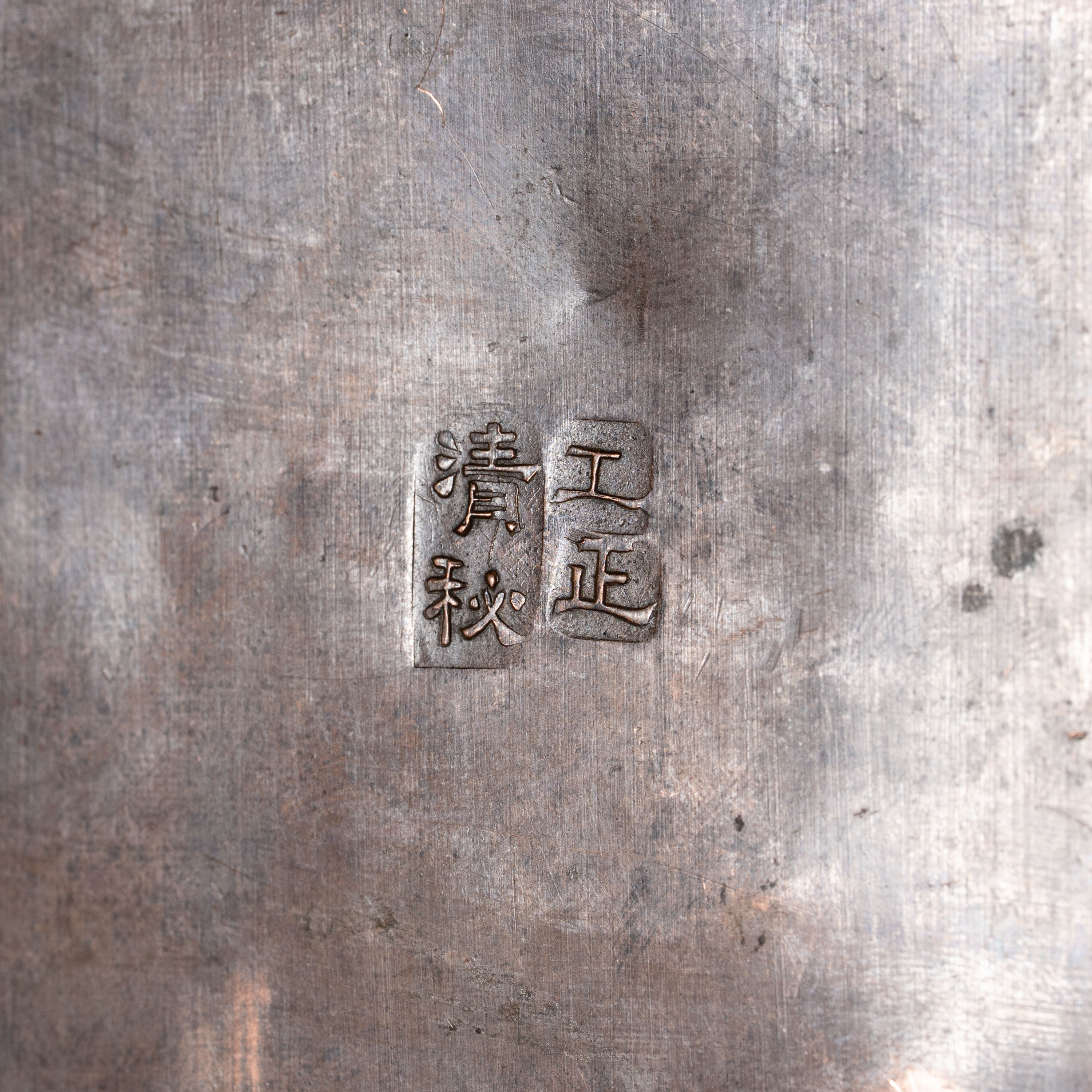 尤为珍稀的是其底款。除著名的“清秘阁”款外,额外刻有“工正”二字。在清秘阁的精品中,带有“工”字款者已属偶见,而“工、正”双款并列则为目前已知存世品中极其罕见的孤例。作为1956年公私合营前的“清秘绝作”,它代表了民国刻铜艺术最后的辉煌水准。