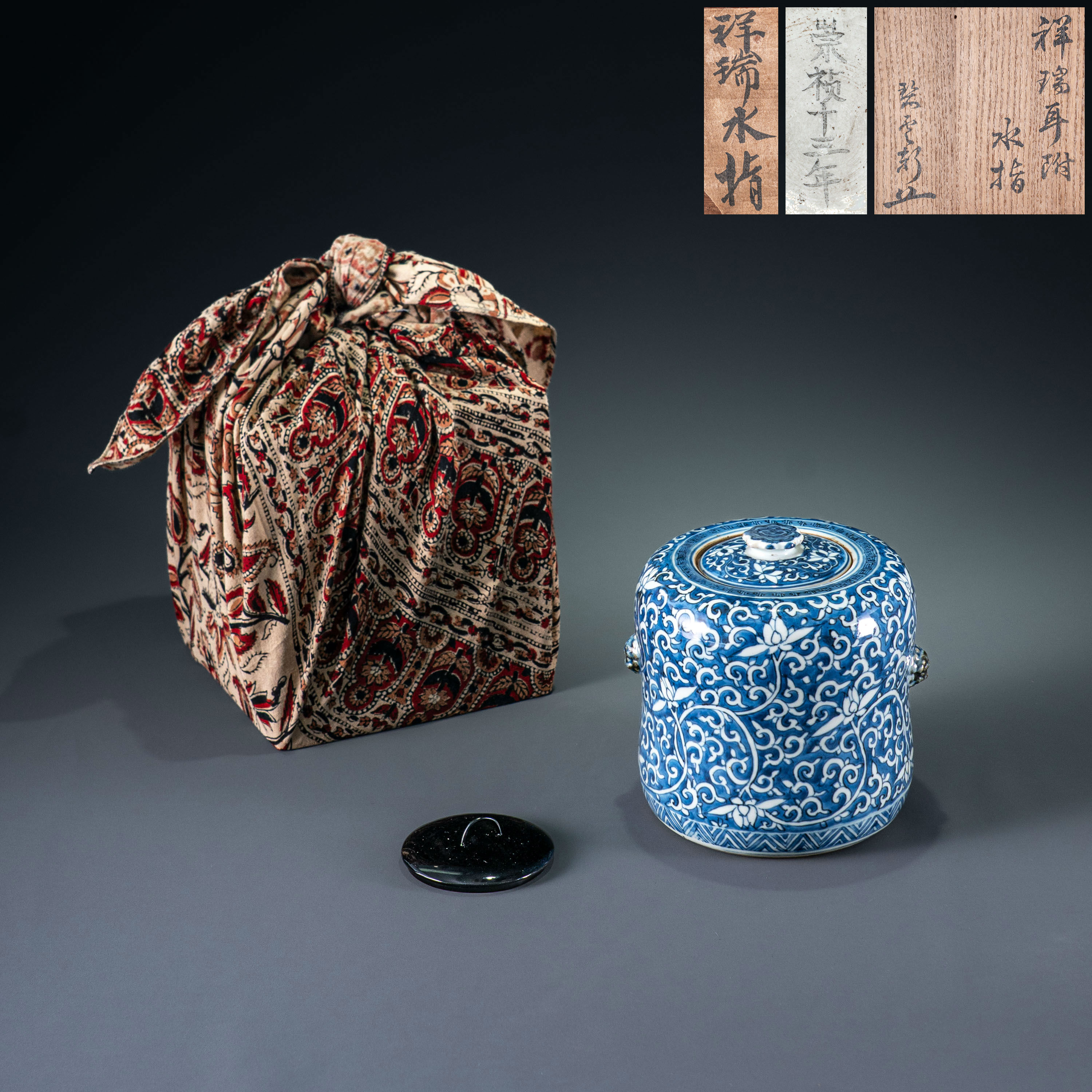 从陶瓷史角度看,此器的“祥瑞”风格不仅代表了吉祥寓意,更与中日陶瓷贸易中著名的“祥瑞瓷”文化深度契合。关于“吴祥瑞”或“五良大甫”的身份,史学界存在正德时期来华学习与明末订单贸易等多种说法。据日本古陶瓷专家考证,此类风格鲜明的青花瓷,多是明末清初时期由以小堀远州为中心的日本茶道界向景德镇专门订购的产物。此件盖罐融合了强劲的唐风与精妙的留白工艺,既保留了景德镇陶工极高的艺术创造力,又带有明显的出口订制色彩。这种独特的器型与卓越的留白技法,在目前的拍卖市场中极受追捧,去岁大羿拍卖刷新纪录的青花地留白器物便是例证。本品集历史断代证据、稀有造型与精湛工艺于一身,实为研究明末瓷器转型期及中日文化贸易史的珍贵实物。