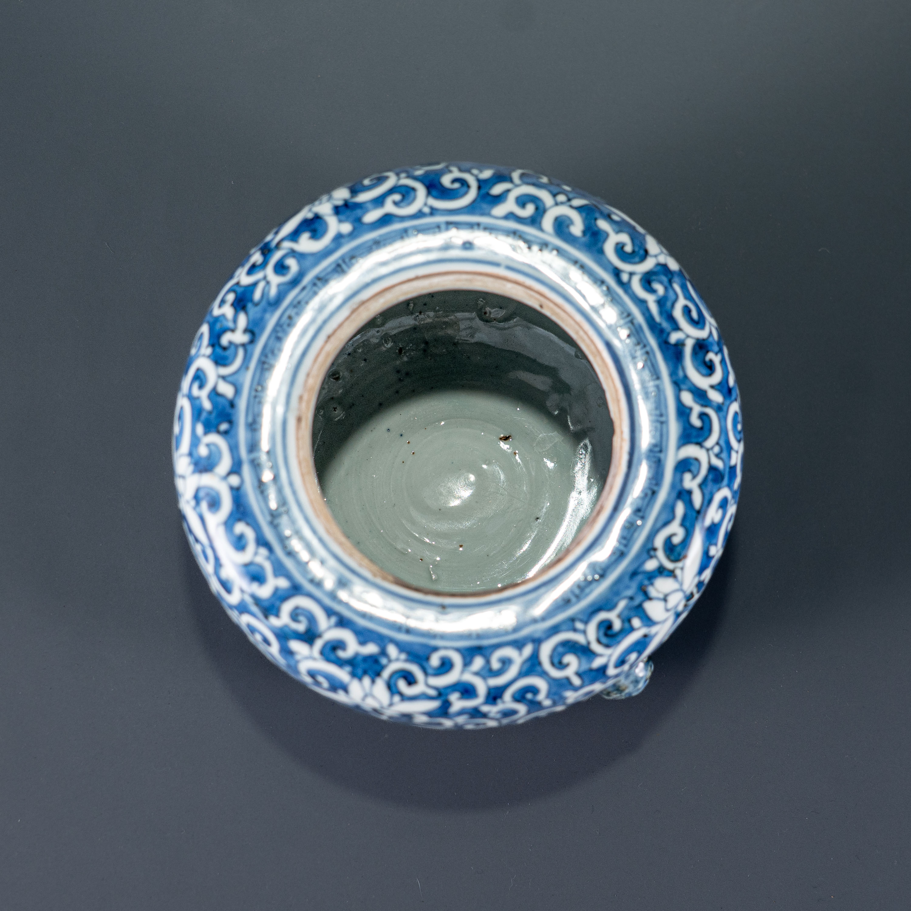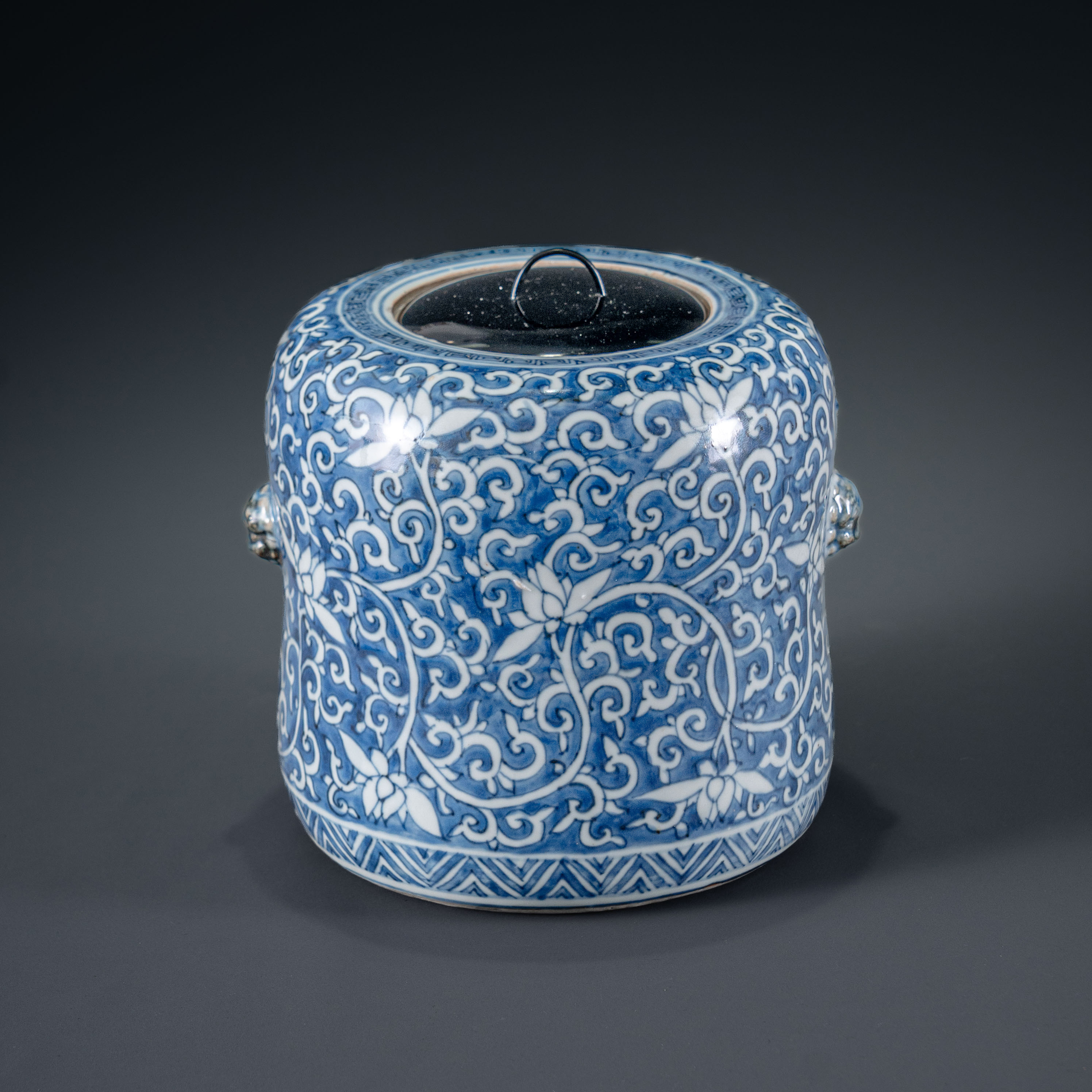 此件青花地留白缠枝花卉纹兽耳盖罐,造型奇特罕见,整体形制似冬瓜罐却更为古拙生动,腹部曲线浑圆且向底部略微收敛,两侧饰以崇祯时期极少见的兽耳,器型充满张力。其装饰工艺采用明末清初最为炫技、最为盛行的“青花地留白”画法(又称青花拔白):以浓艳的青花为地,勾勒出繁密而灵动的缠枝花卉,形成强烈的视觉对比。在当时“官搭民烧”的背景下,此类制作精绝且造型不落俗套的器物,当属景德镇民窑巅峰之作,专为达官显贵或高等级定制需求而生。