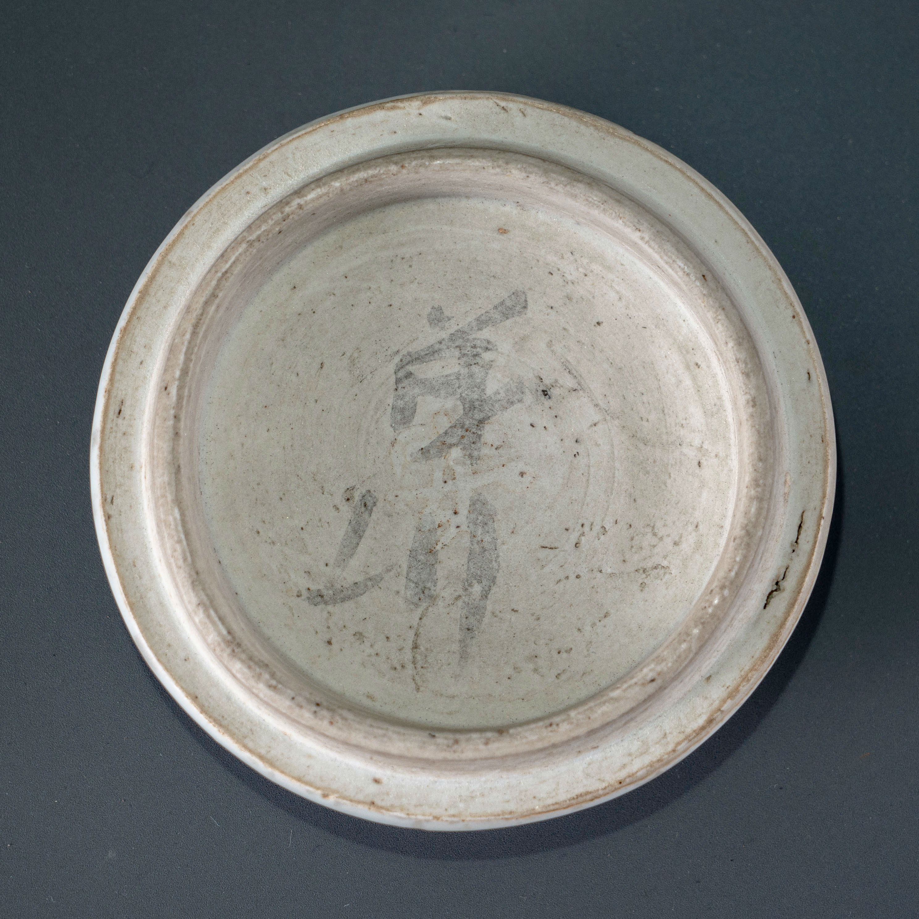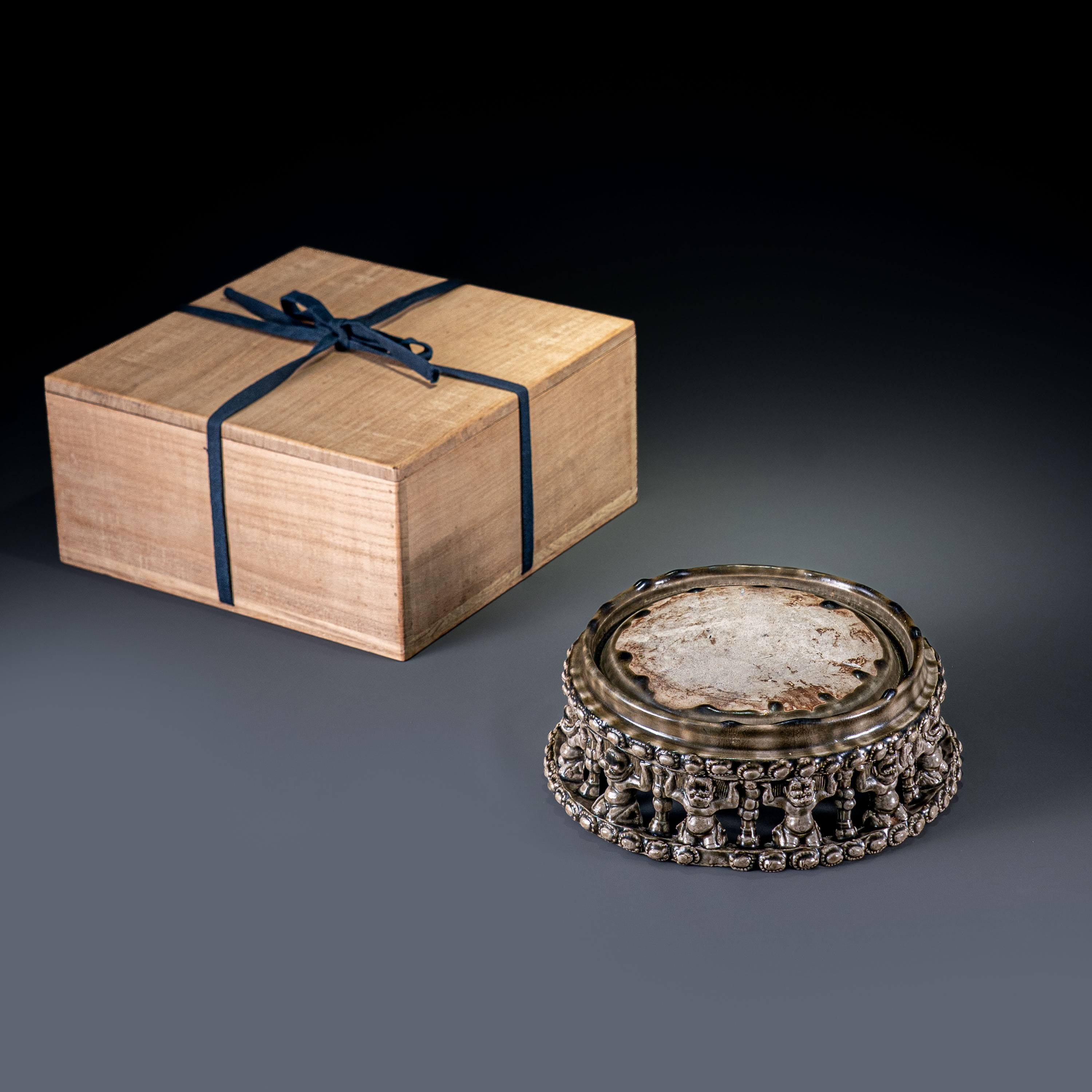 从釉面工艺来看,此砚展现了相州窑青釉典型的流淌感,积釉处呈现出莹润的玻璃质感。釉面满布苍古的开片,如树纹般自然生动,这种深邃的开片纹路是现代仿品无法企及的艺术壁垒。虽底部留有一处自然的窑粘,但这恰恰是隋代装烧工艺的真实物证,不仅不掩其美,反而增添了历史考证价值。在当今老窑瓷器价值被还未被完全挖掘的市场背景下,这类制作工艺极繁、体量硕大且带有力士装饰的隋代孤品,无疑是老窑文房器中最为罕见的器物,乃至于可供参阅的相似器物都未曾可见,背后的学术价值不可估量。