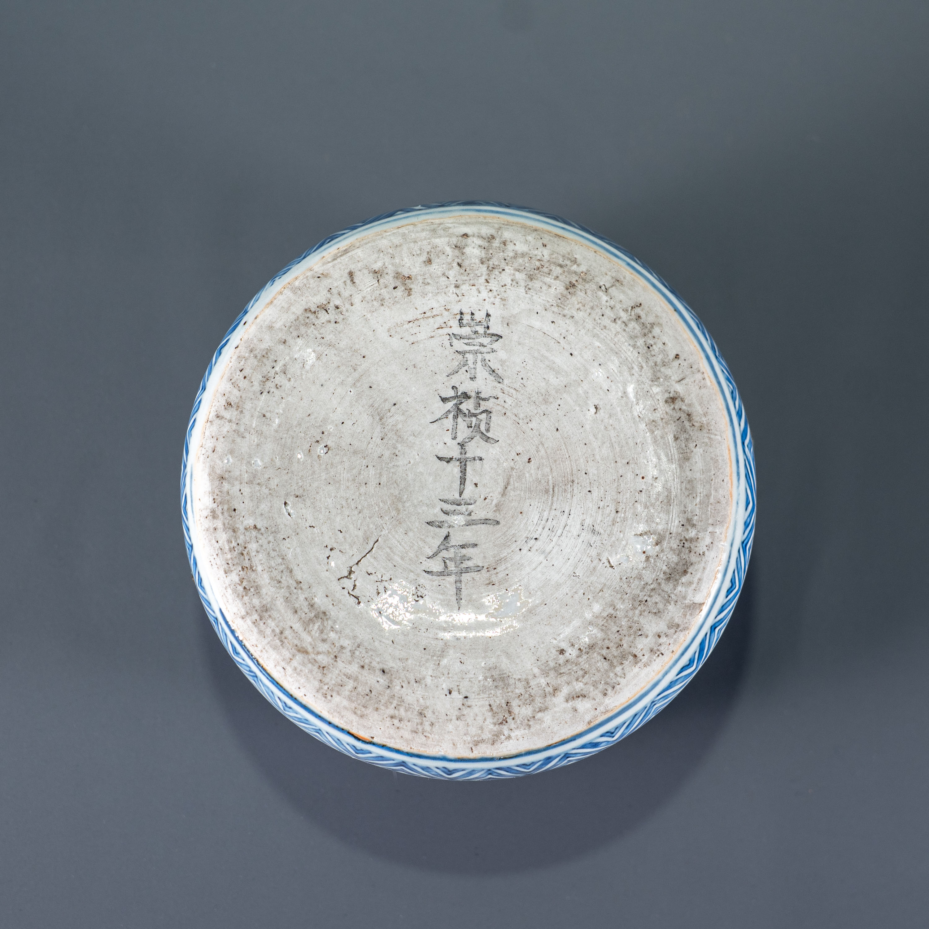 器物底部存有珍贵的墨书“崇祯十三年”记事,虽非高温烧制的年号款,却极为明确地交代了其生产的具体时代坐标。崇祯十三年(1640年)正值大明王朝末期,社会剧动,而此罐却呈现出一种极高的艺术水准,侧面印证了晚明文人阶层对精致生活的追求。尤为值得关注的是其流传背景,此器原为日本藏家旧藏,日方命名为“祥瑞水指”。