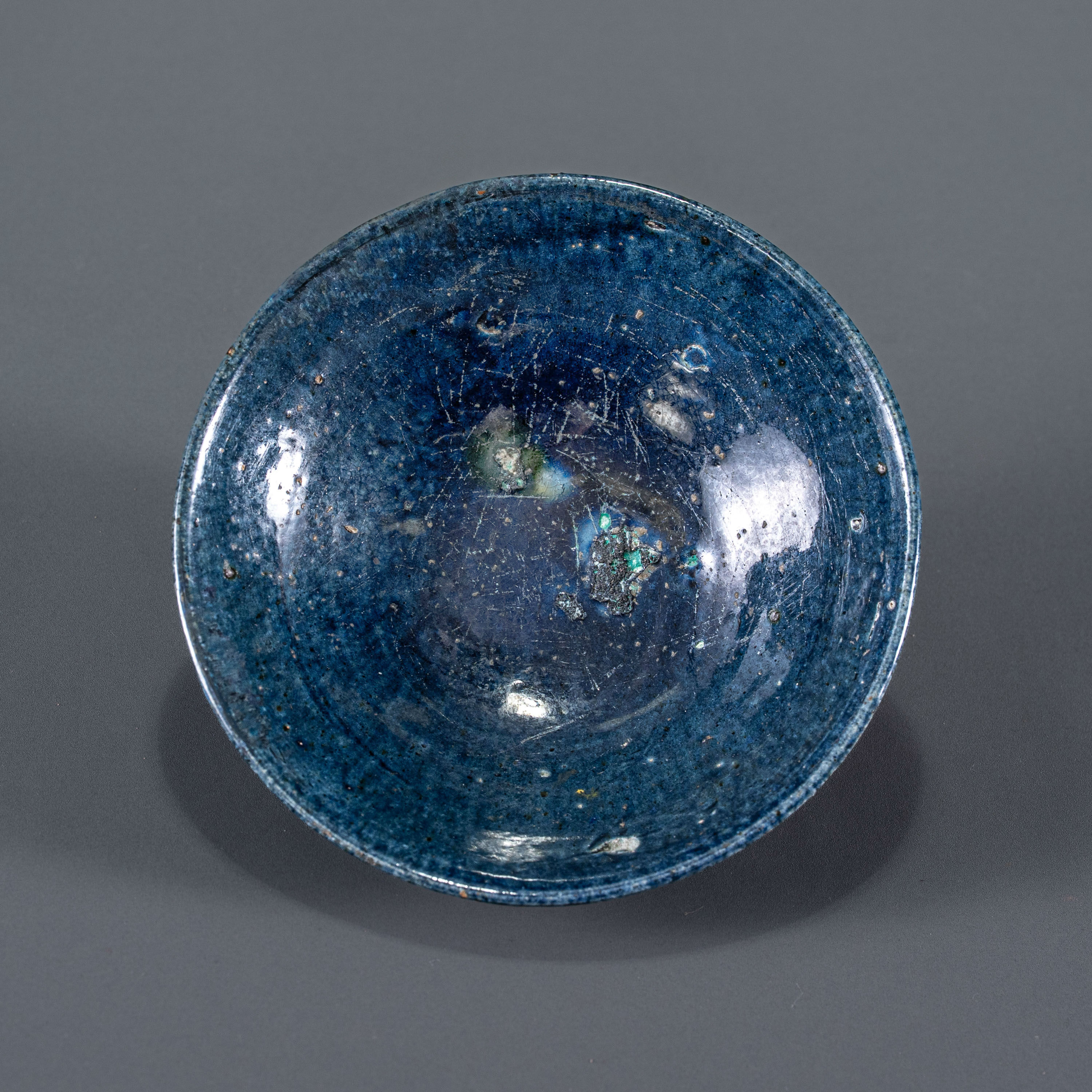 在古代文化语境中,蓝色曾因其冷调而带有某种神秘甚至令人悚然的宗教与禁忌色彩。然而,大唐的工匠们打破了这种思想束缚,将这种“个性的颜色”引入陶瓷领域。此碗釉面发色深沉饱满,犹如深邃的星空,釉汁流淌自然,包浆温润且极具时代特征。其简洁的单色表现力,不仅展现了唐代对复色工艺的探索,更体现了那个时代不拘一格、海纳百川的审美气象,是一件存世稀少、具有极高学术与收藏价值的唐代蓝釉精品。