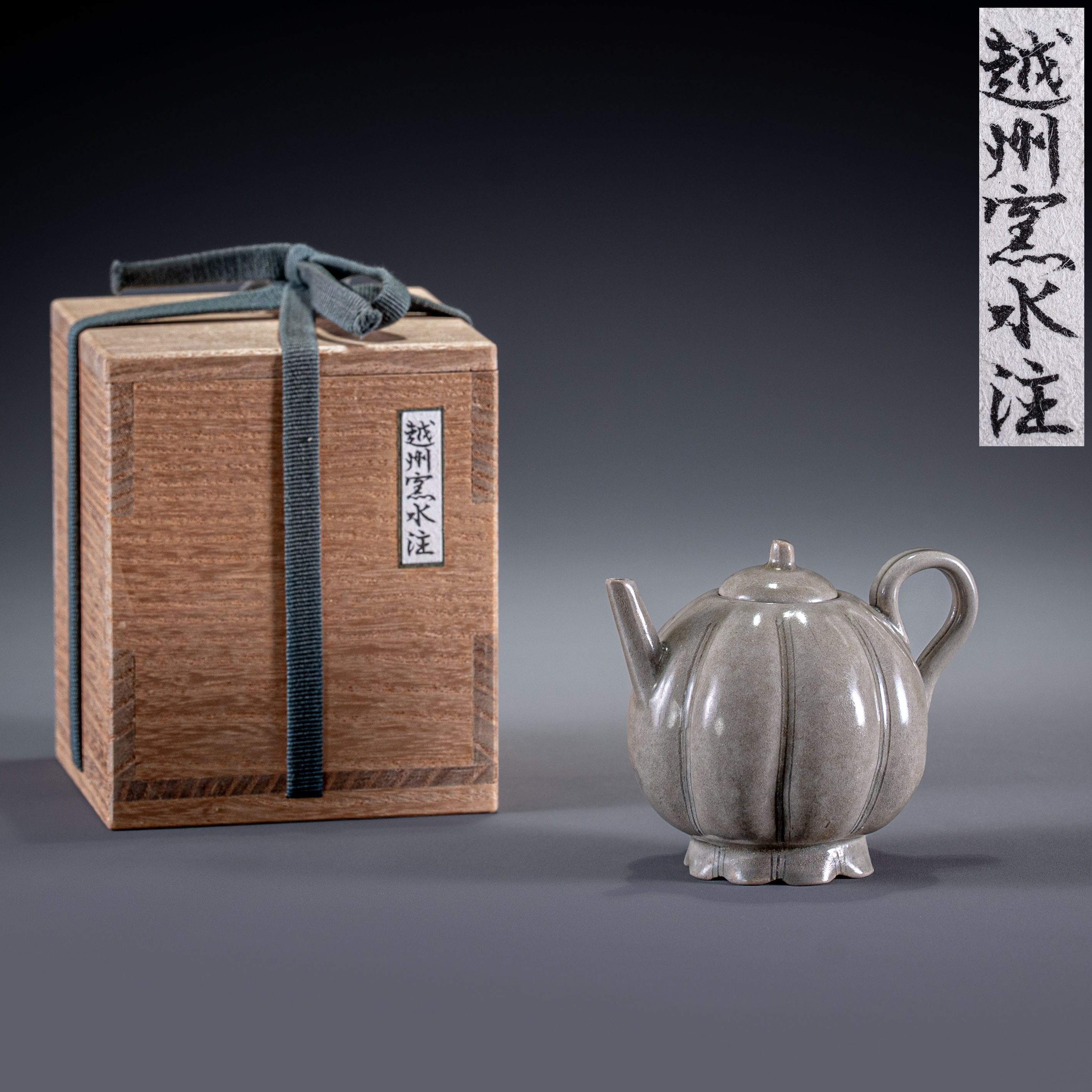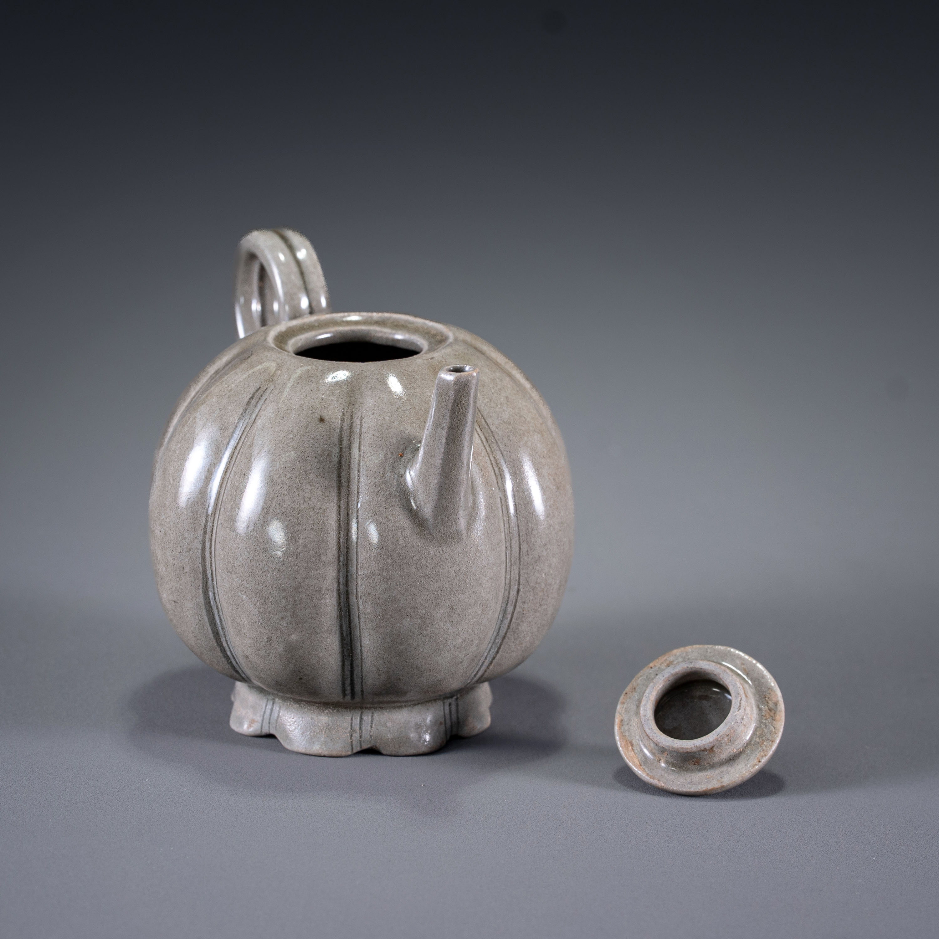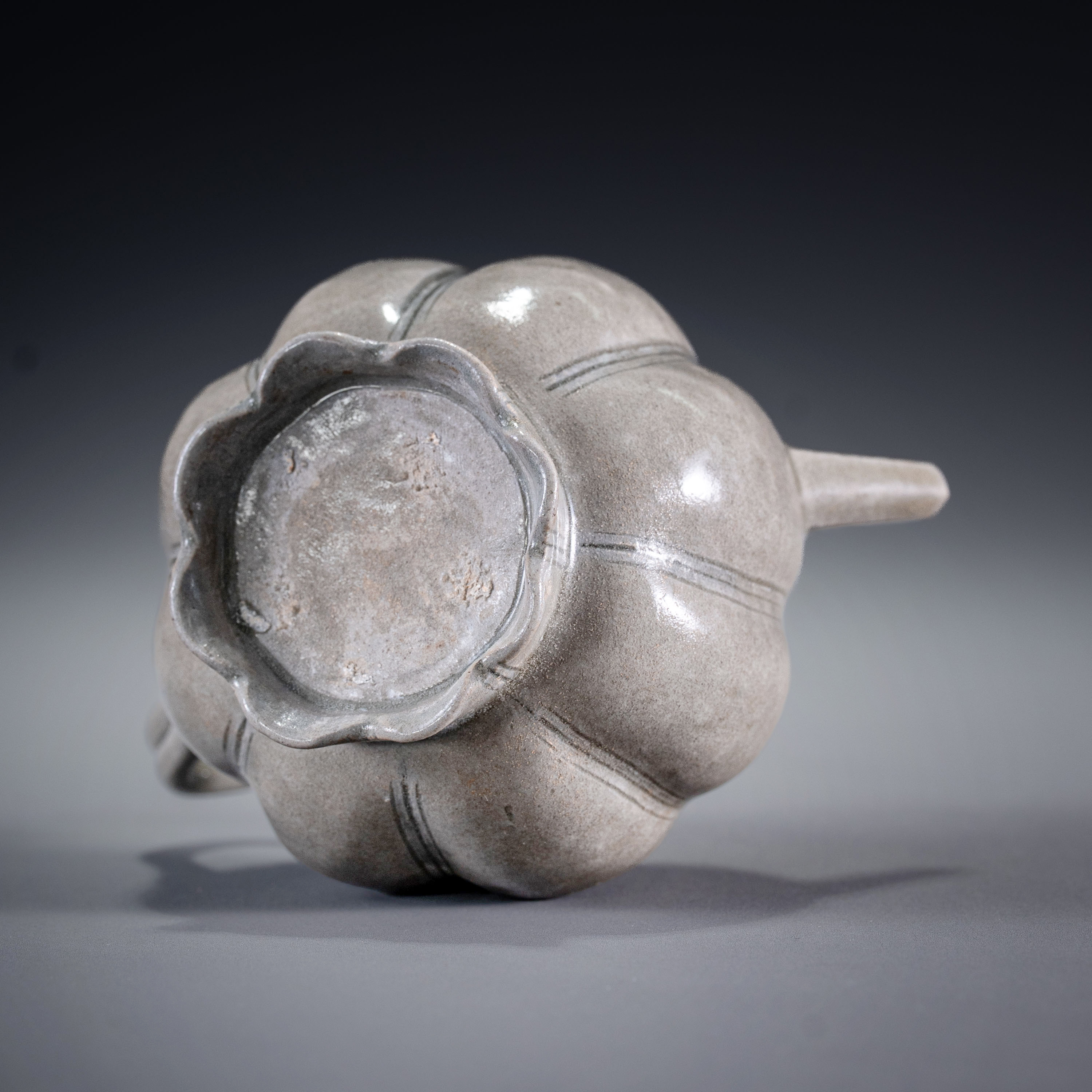 此水注约烧造于公元一千年左右的五代时期,应为当时南方窑场的精细之作。这种成熟的瓜棱形制,极有可能是后来高丽青瓷审美与造型的重要母型来源。整器胎骨坚致,包浆自然,不仅是一件文气十足的实用器,更是研究早期青瓷器型演变及东亚陶瓷交流史的重要实物标本。
