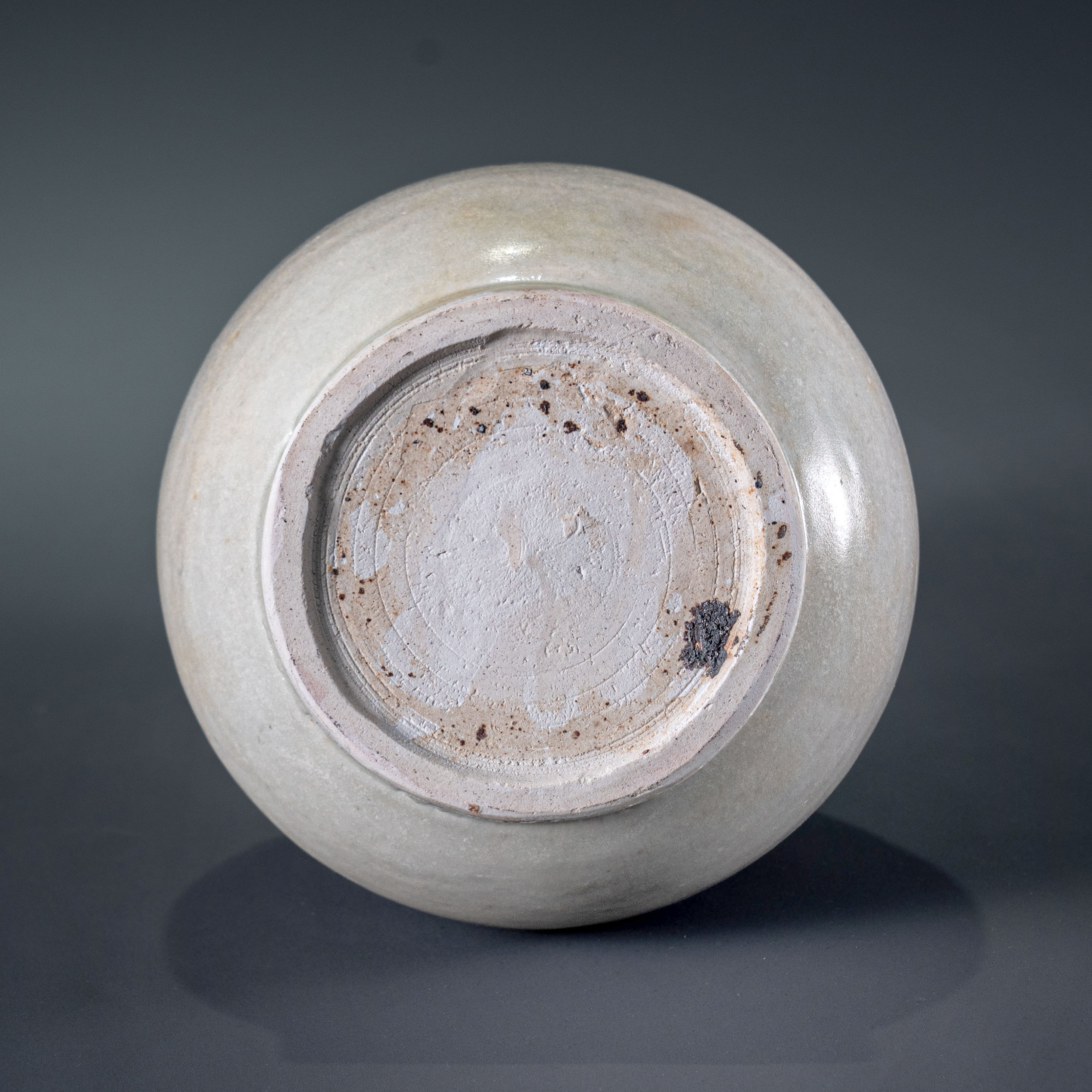 翻转可见圈足修削方正有力,胎质坚致干老。足端由于烧造工艺形成的火石红自然过渡,体现了龙泉窑大器的典型制作特征。此壶不仅形制稀有,且原盖保存完好,是研究龙泉窑大件器物烧造工艺与古代酒具文化的珍贵实物,陈设气场极强。