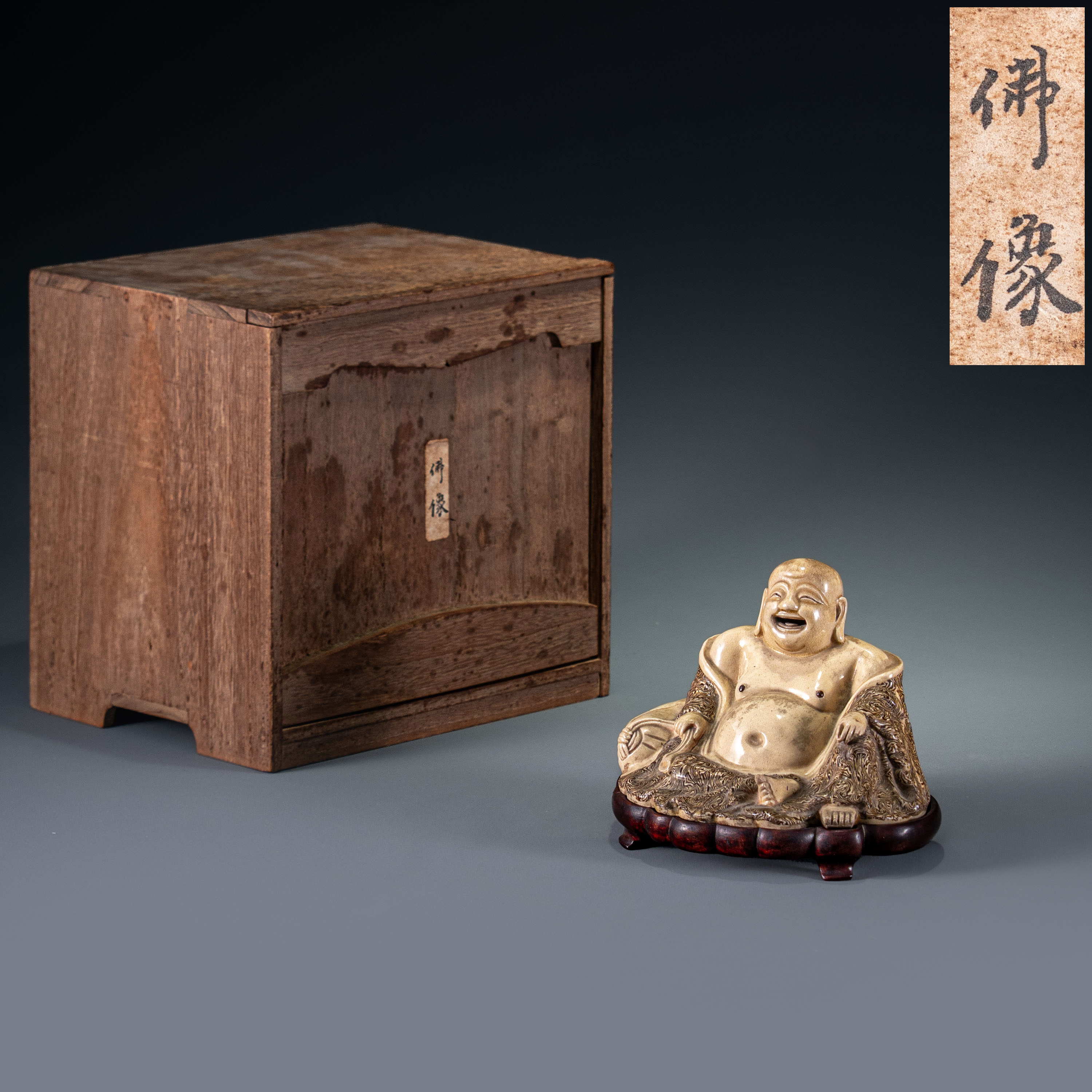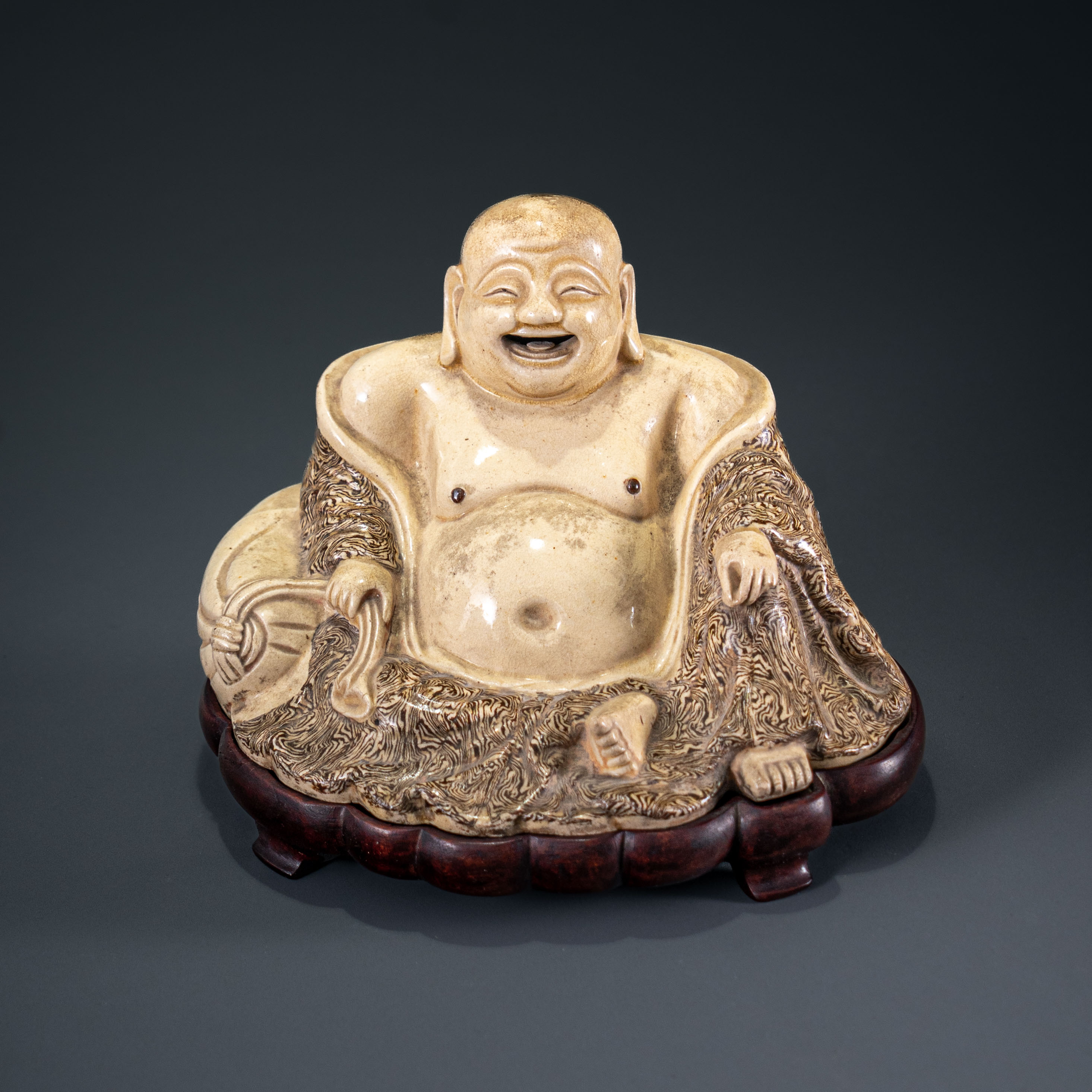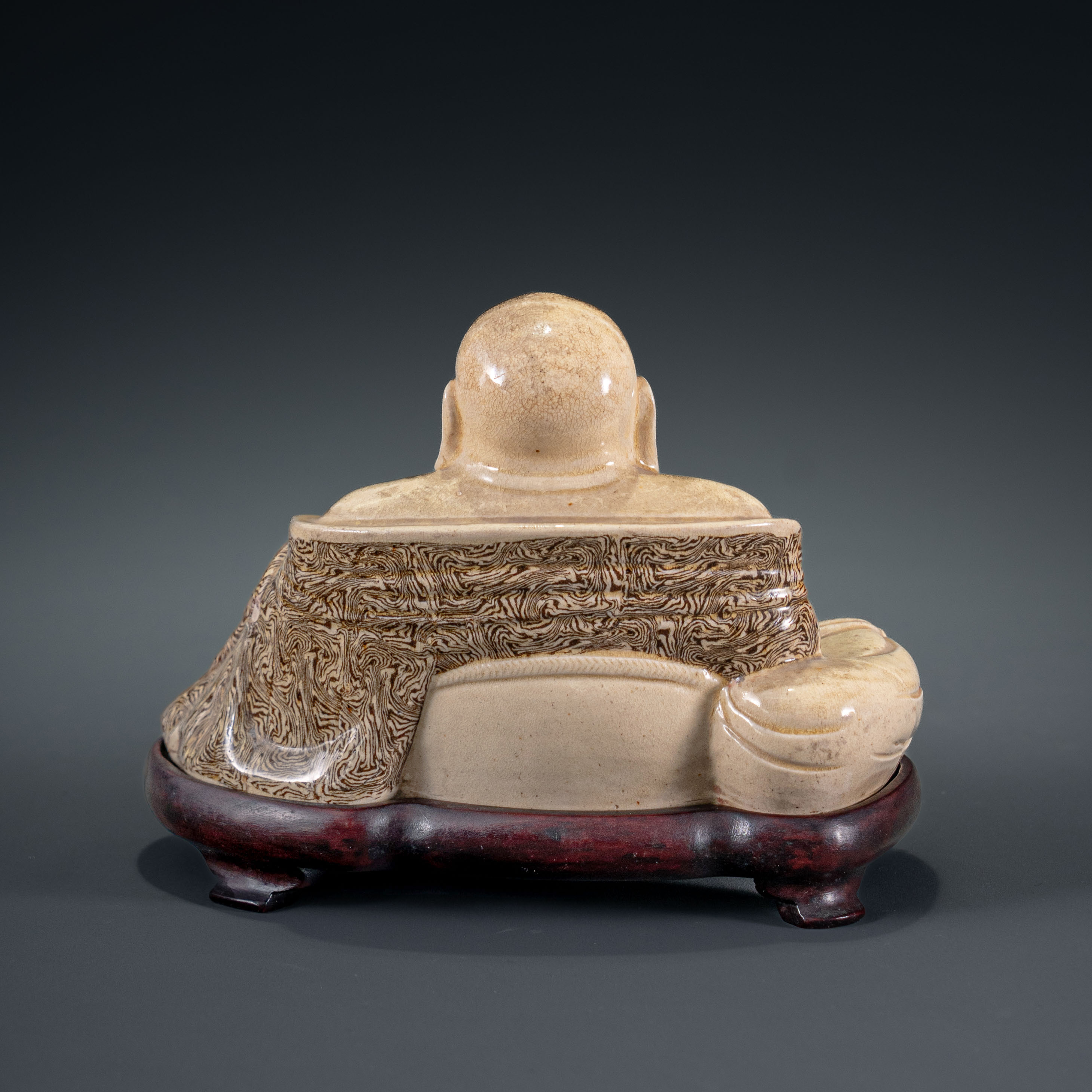 此件弥勒佛像为明晚期宜兴窑之罕见精品,其工艺特色鲜明,融合了紫砂泥料艺术与古老的绞胎技法。绞胎工艺虽始于唐而盛于宋,但在北宋末年渐趋式微,至明代仅在北方部分窑口零星传承。而宜兴窑的绞胎则另辟蹊径,脱离了传统瓷器的范畴:本品以宜兴特有的白泥为基调,其烧成后自带一种天然的油脂感,较之北方瓷土更为温润细腻;其独特的“流云纹”则是通过紫砂泥与白泥的交错揉和而成,纹理自然灵动。佛像通体施米色釉,釉层薄如蝉翼,其下绵密的开片纹路如冰裂般交织,形成极富禅意的视觉效果。