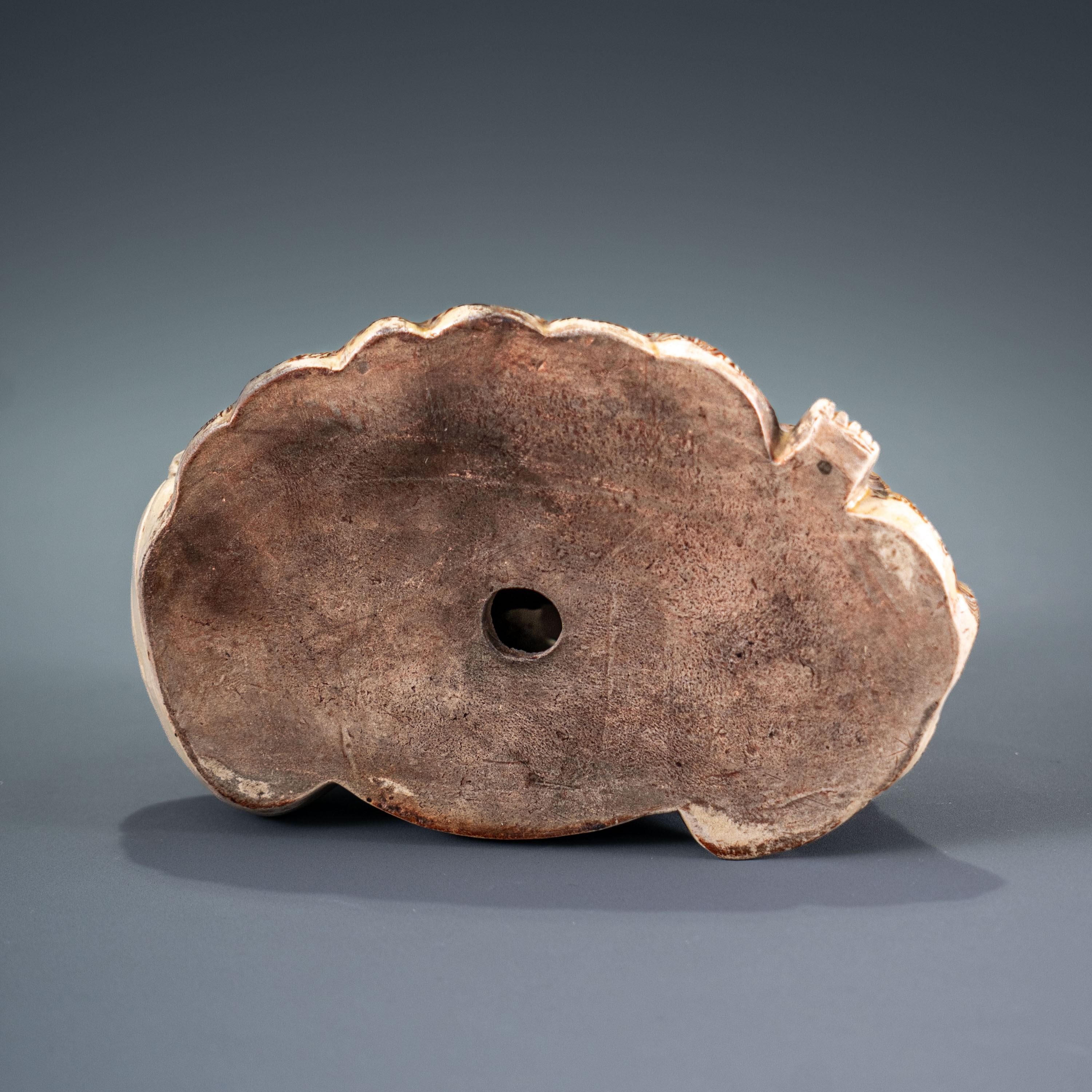 此物在日本地区流传已久,底座或包装上赫然贴有“赤座氏”家纹。赤座氏作为日本历史上的武士家族,其家纹的出现不仅赋予了这件器物明确的家族传承背书,更佐证了其在江户至明治时期作为高规格舶来品进入日本上层社会的历史地位。此件香具集中国传统雕刻、金银工艺与日本家族传承文化于一体,是中日文化贸易往来的实物见证。其保存完好,题材吉祥,且具备深厚的历史人文底蕴,是文房收藏领域中极为罕见的、带有明确流传印记的精品。