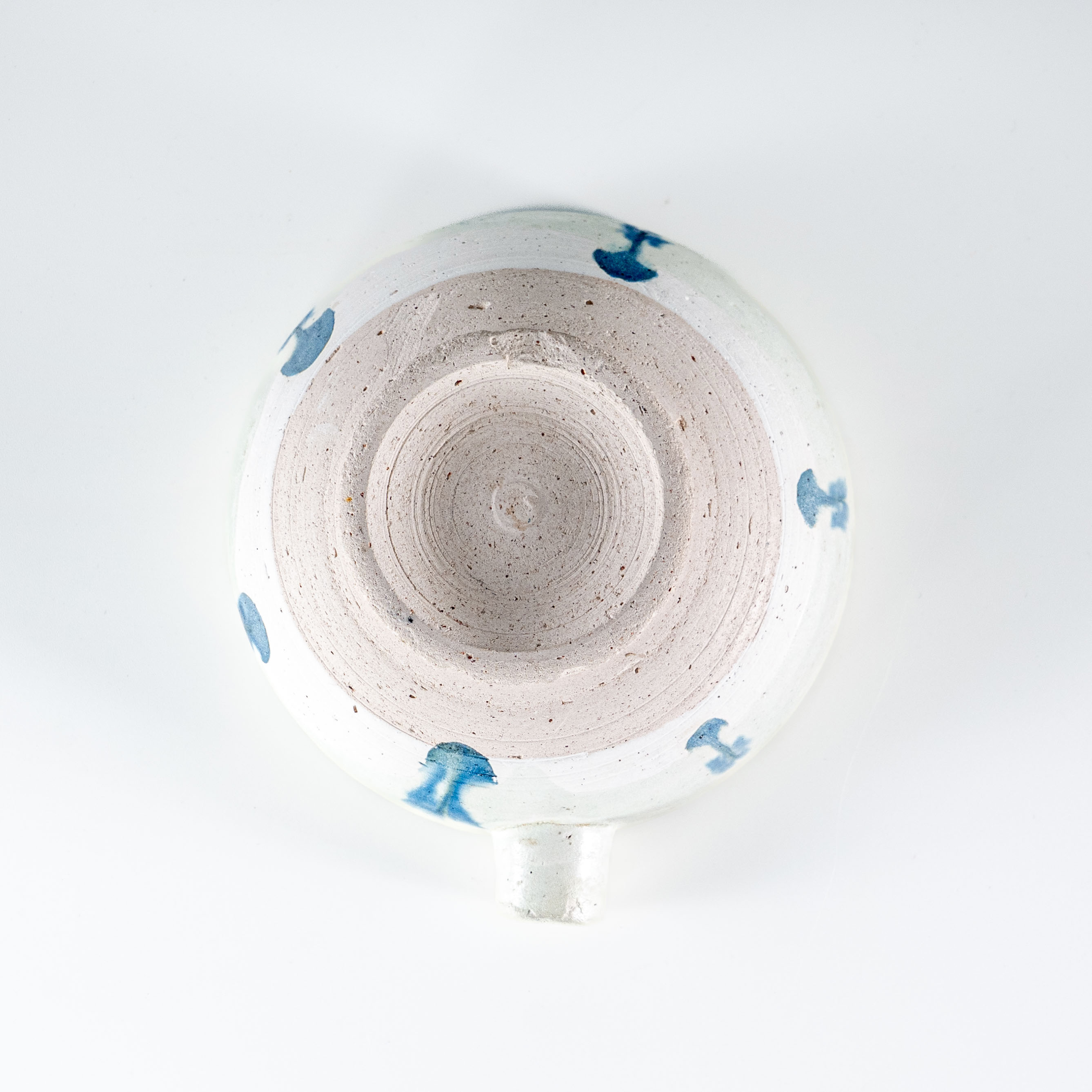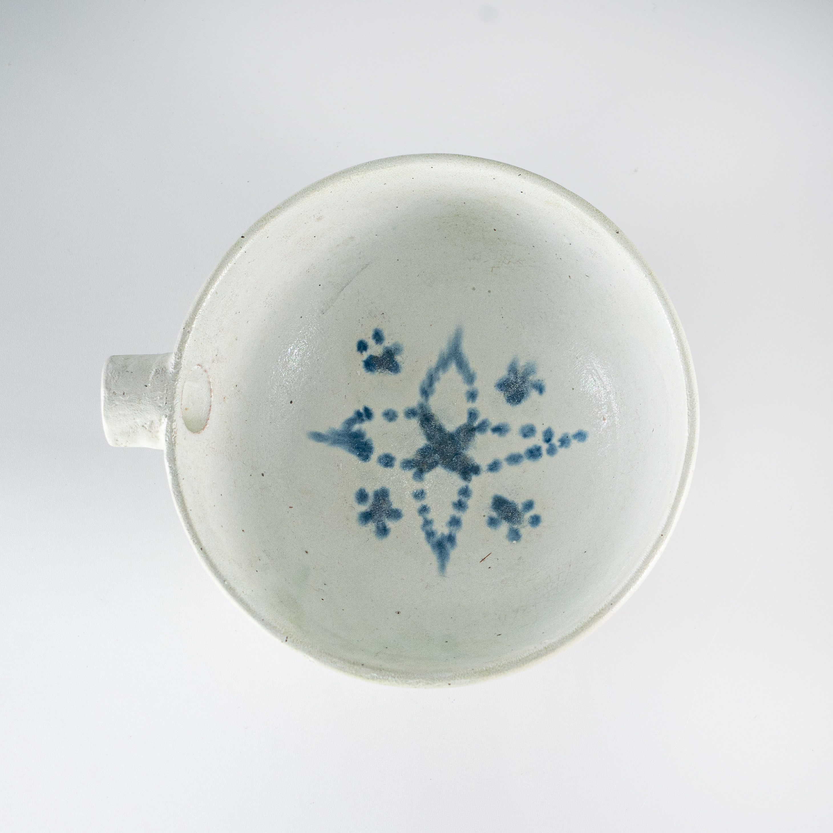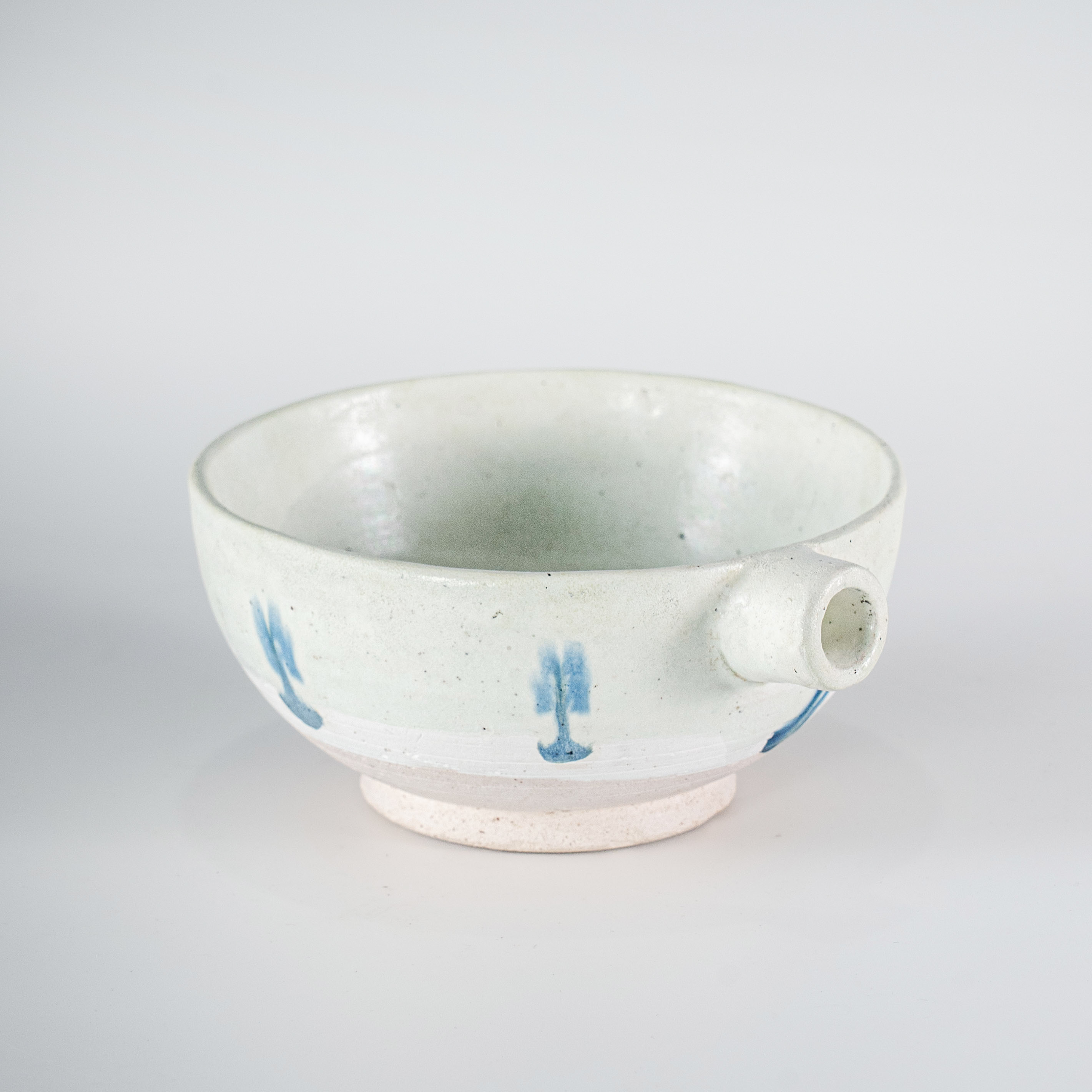 由于采用了高温烧造,钴蓝料在白釉的覆盖下呈现出深邃而自然的晕散感。这种罕见的“匜”式形制与早期高温蓝釉探索的结合,使其在工艺复杂度和审美稀缺性上都远超同时期的常规器皿,是研究唐代巩县窑本土艺术风格与器型演变不可多得的重器标本。