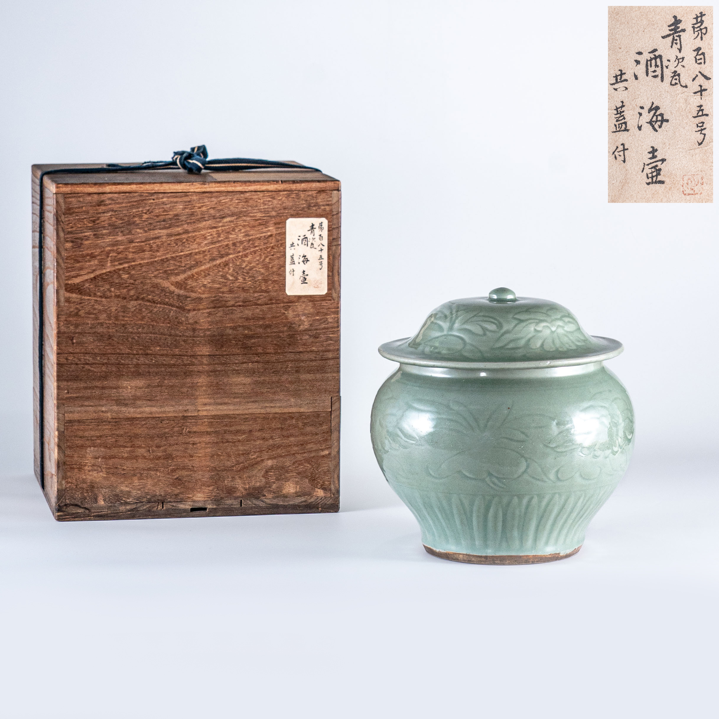 此壶造型宏大磅礴,由原装伞形盖与圆腹壶身组成,盖顶设半球形纽,整体比例沉稳协调。这种带原盖的大型盛酒器,在龙泉窑传世实物中极为罕见。日本传世包装箱书将其定名为“酒海壶”,直接点出了其在古代高规格宴饮中作为盛酒重器的特殊身份。
