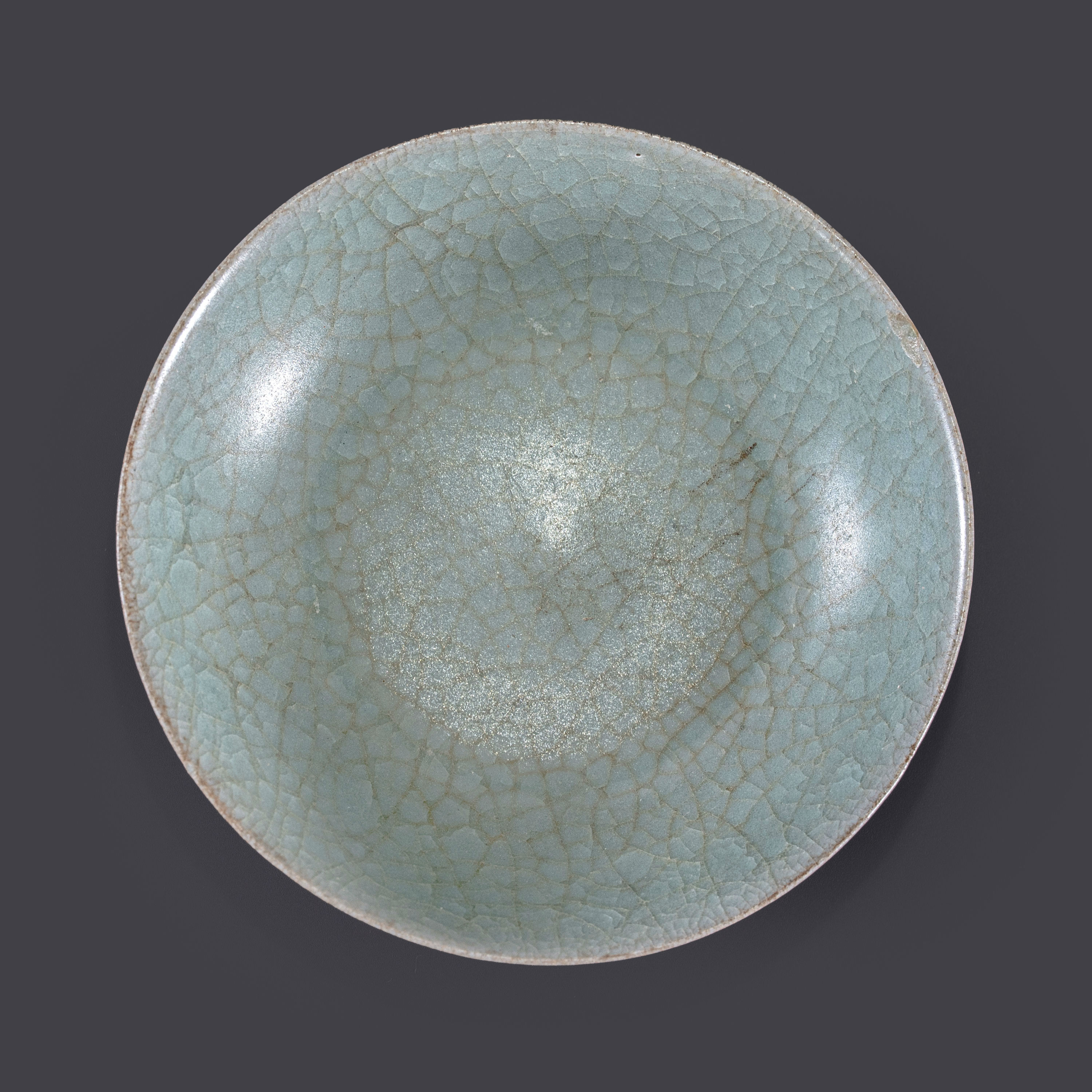 在釉色与工艺上,本品标志着龙泉窑从“薄釉类越窑”向“厚釉类官窑”转变的突破。釉层较早中期明显增厚,色泽翠润,已具备南宋粉青釉的雏形。由于胎釉膨胀系数差异,釉面形成层层叠叠的开片,局部呈现“金丝铁线”效应。这种开片现象并非瑕疵,而是北宋晚期龙泉窑在追求高温钙碱釉质感过程中,对官系审美(如汝窑、汴京官窑)的主动摹仿与技术回响。