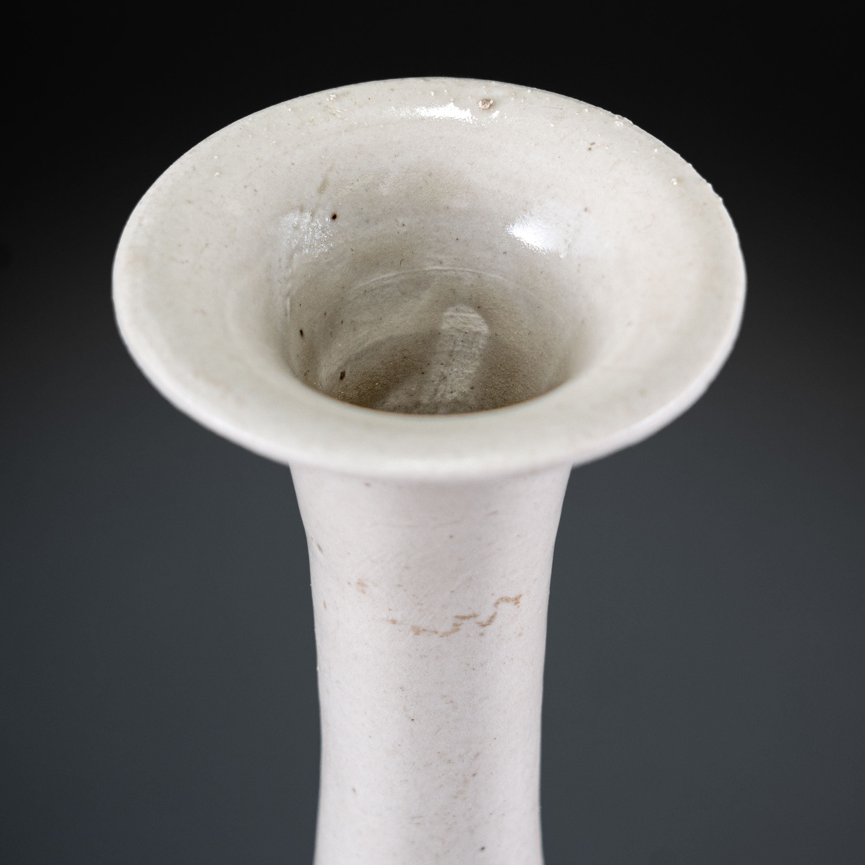 此瓶撇口、细长颈、垂腹、圈足,造型呈现出宋代特有的舒朗与挺拔。玉壶春瓶由唐代净瓶演变而来,至北宋定窑时期,其比例更趋协调,线条由颈部向腹部转折自然,展现了极高的成型工艺。