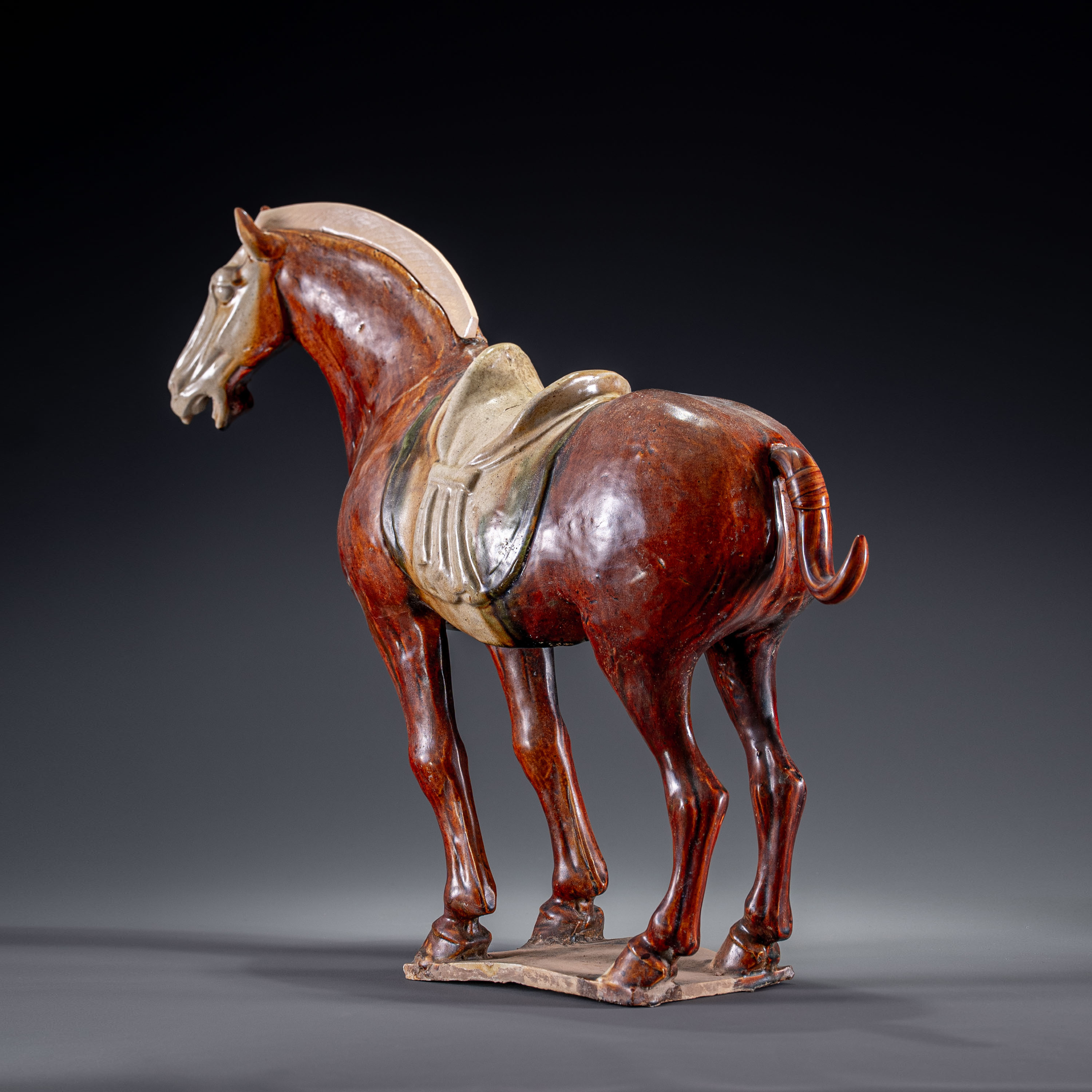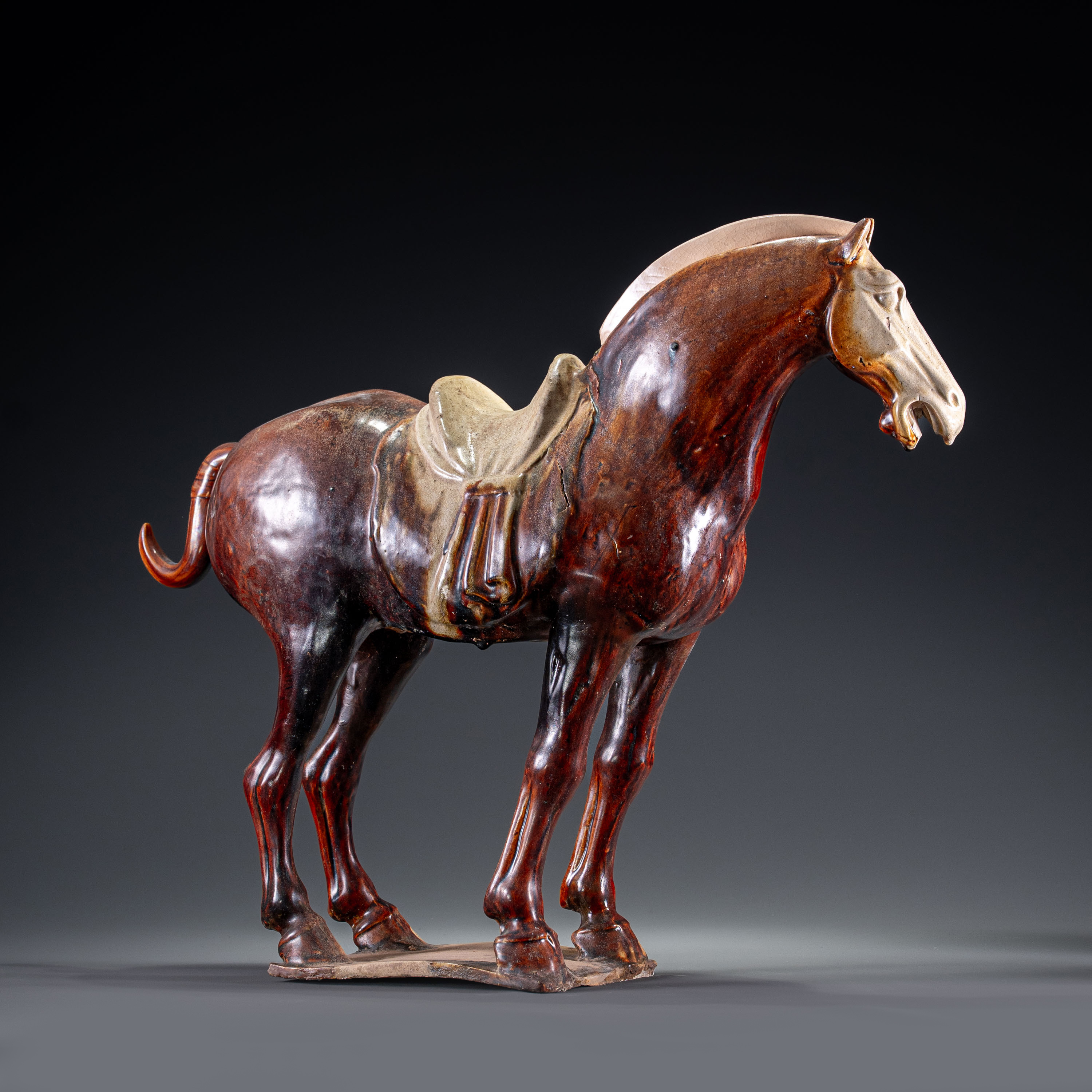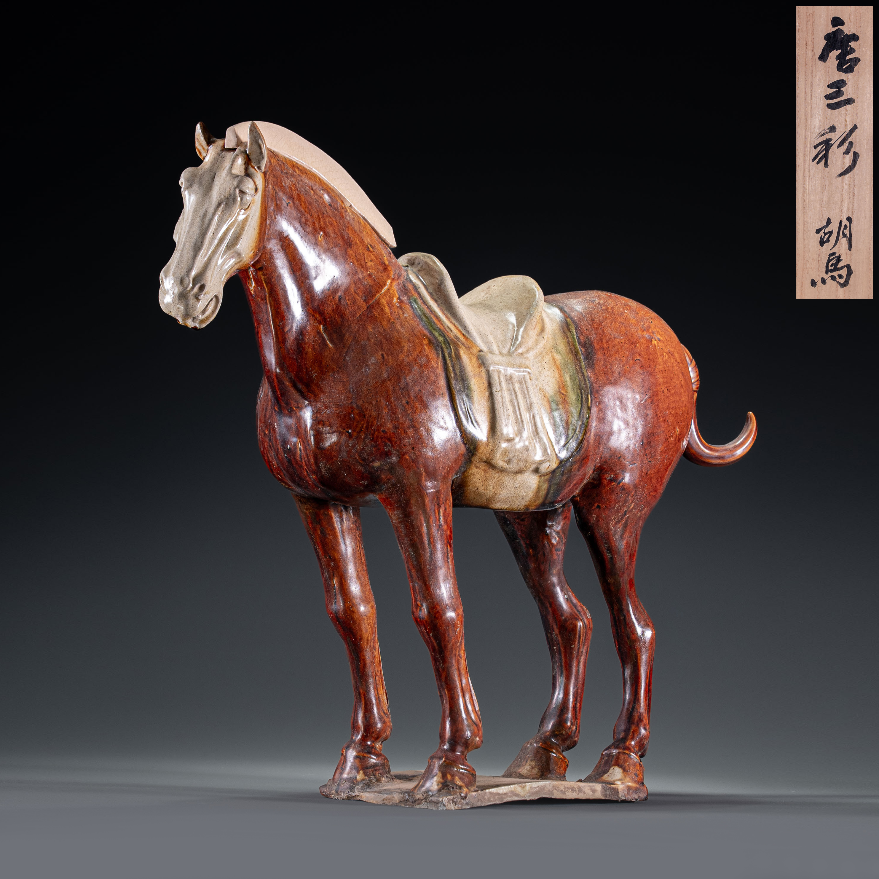 在施釉上,此马表现出极高的艺术水准。浓郁的焦糖色釉流淌自然,与马头、马鞍处的留白形成虚实对比,神韵灵动。加藤卓男先生的精准修复,不仅补全了器物的残缺,更是一场跨越千年的艺术对话。此器集大唐盛世的磅礴气象与当代顶尖匠人的敬畏之心于一体,既是学术研究的珍贵标本,更是中日文化艺术交融的绝佳见证。