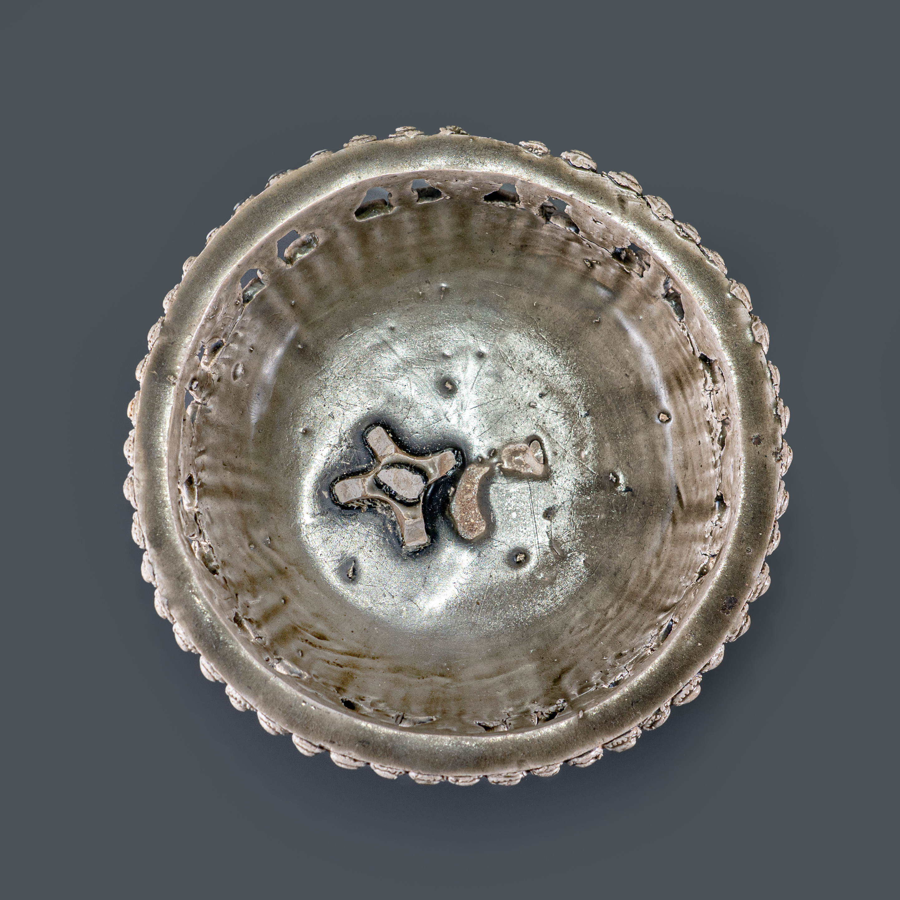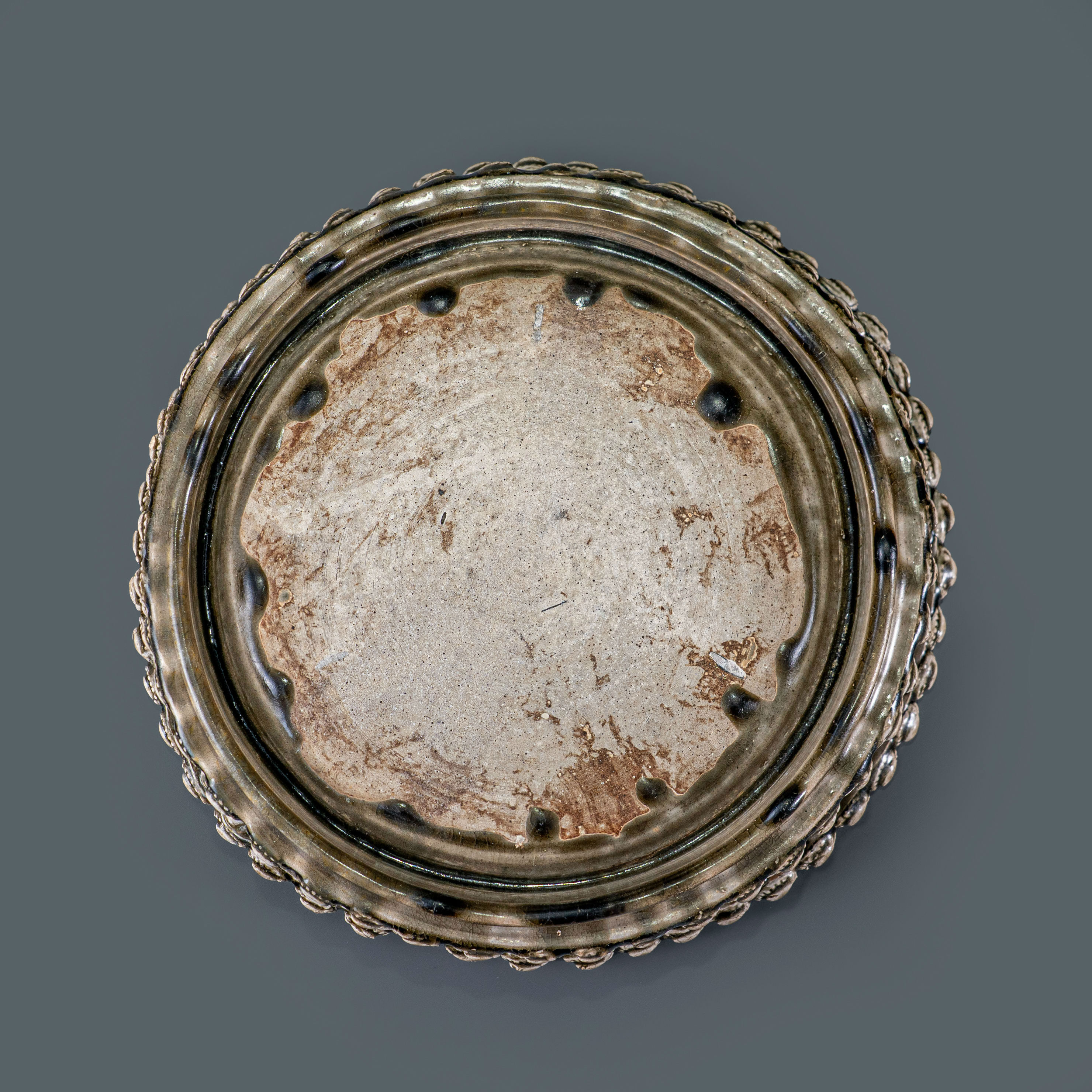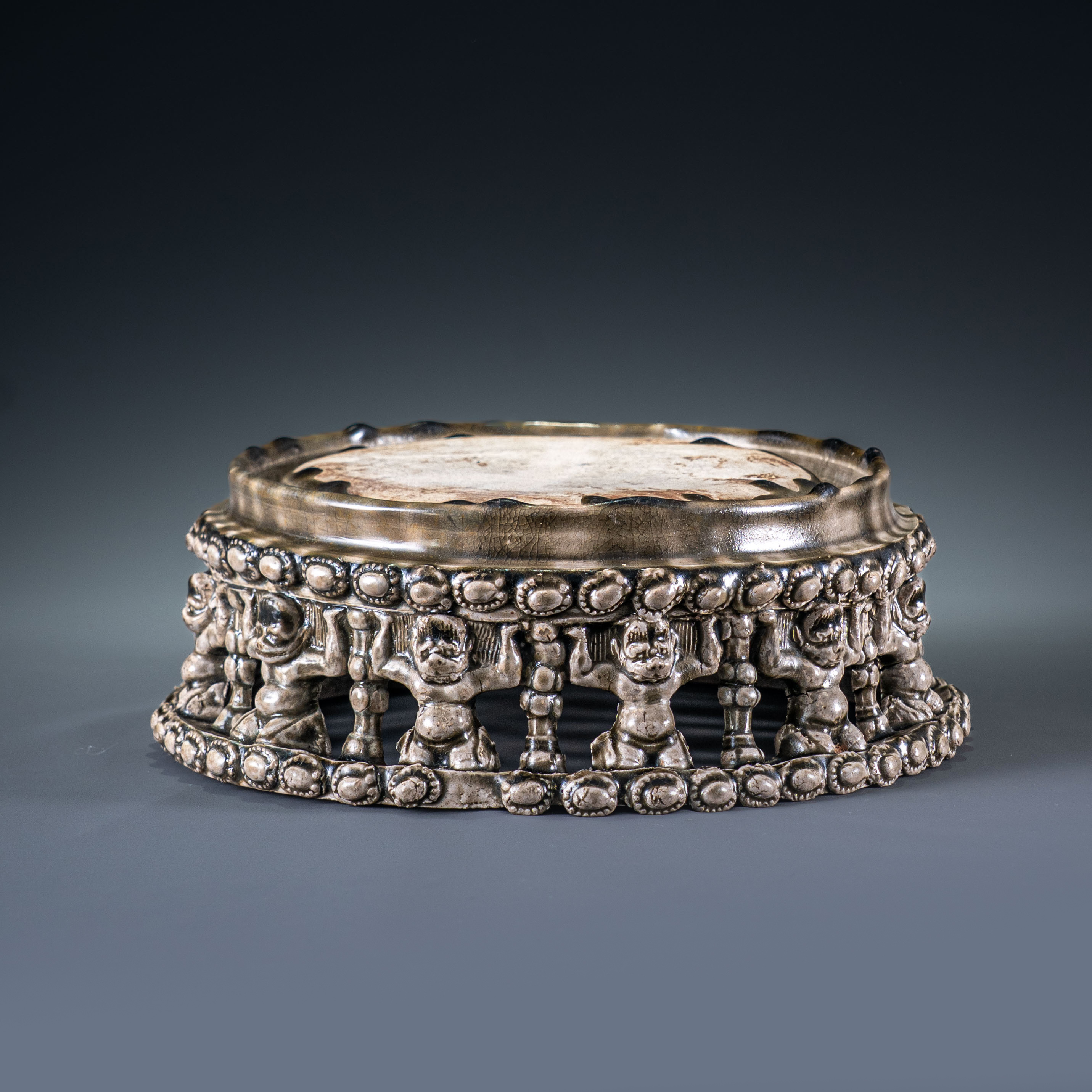 相州窑始于北魏,盛于隋而衰于唐,在中国陶瓷史上具有承前启后的重要地位。辟雍砚作为隋代文人风骨的缩影,其形制取自汉代皇家最高学府的建筑意象,象征着礼制与学识的融合。隋唐时期是辟雍砚发展的鼎盛阶段,造型最具特征且制作最为精细。此件相州窑辟雍砚规格极宏,直径达29厘米,体量直逼西安博物院所藏同类器之冠。其最为震撼之处在于砚底多达24只足,其中包含12尊浮雕力士足,这种工艺在史料与近十余年的拍卖记录中前所未见。相比于常见的熊足、兽足,力士足在此之前甚至都没有完整的器物现存于世,展现了隋代最为顶尖的雕塑技艺与厚重的艺术张力。