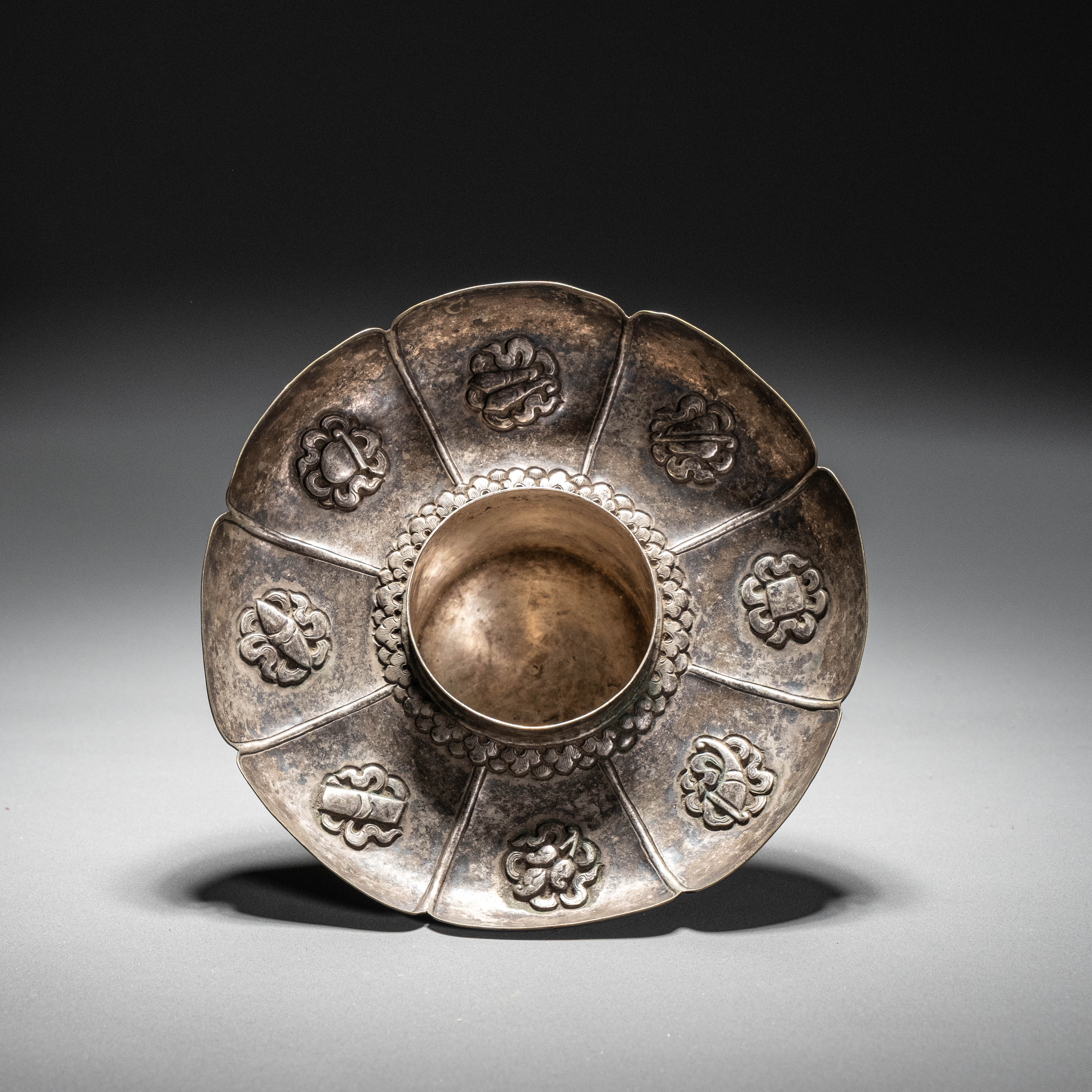 同款清代银錾八吉祥纹器物可参阅一例,曾售于中贸圣佳2025年6月LOT1020,成交价149,500 RMB。