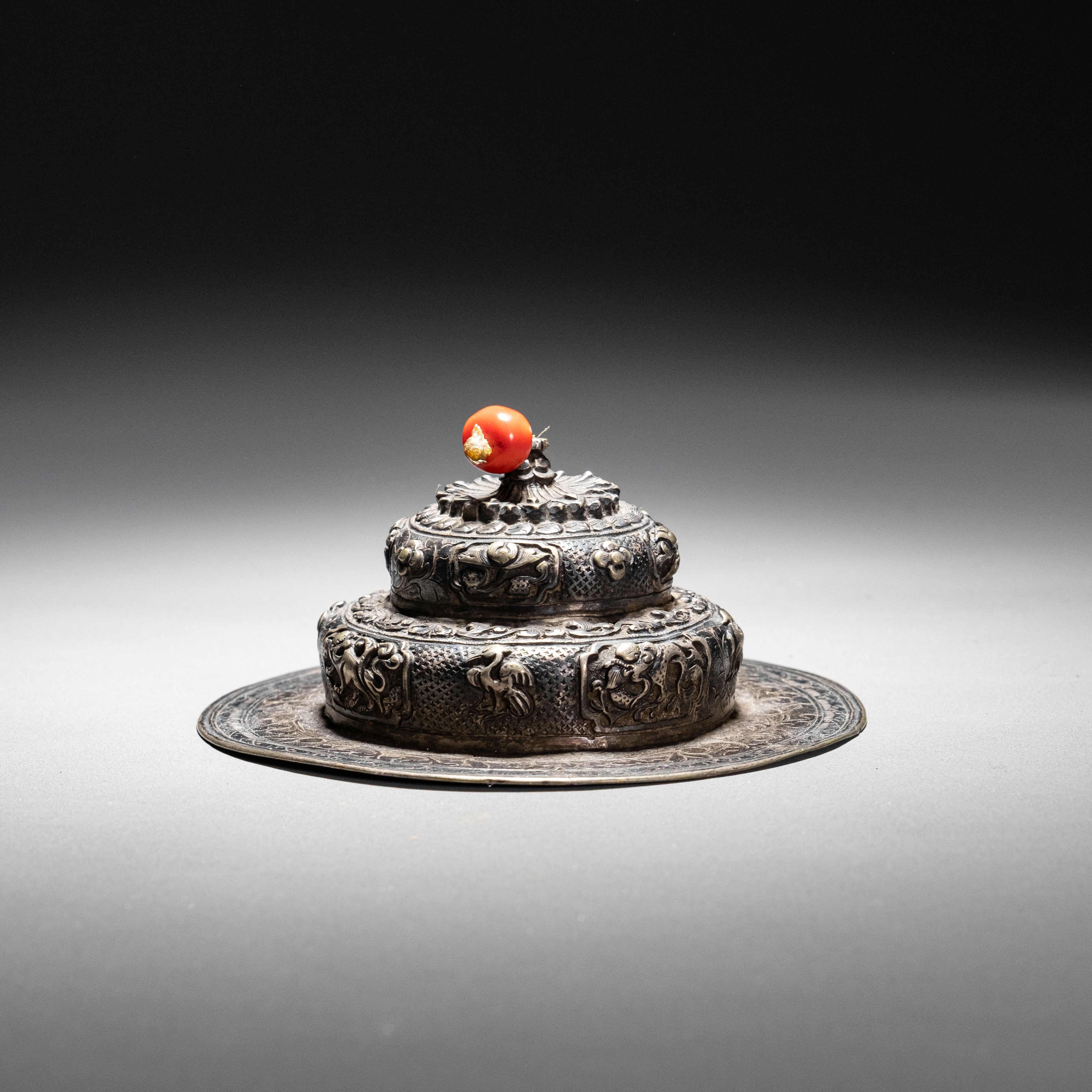碗盖顶部嵌有一颗硕大红润的珊瑚钮,周边饰以立体威猛的云龙纹与瑞兽纹,工艺繁复。整套器物将翡翠三彩的清雅与银胎八宝纹的华贵完美融合,器制古朴而不失宫廷威仪。它不仅是一件清代顶级的生活清供,更是当时满蒙汉文化交融与藏传佛教信仰深度影响工艺美术的实物见证。