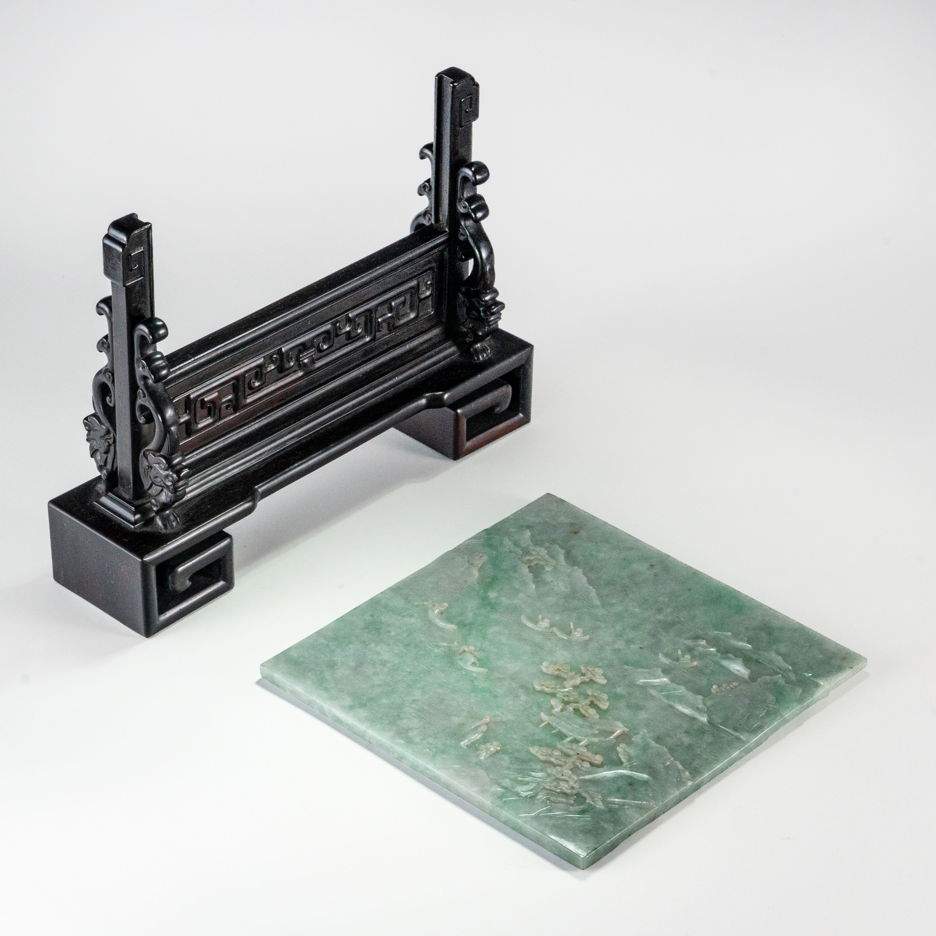 整器雕工极其繁复精妙,高、浅浮雕技法运用自如,完美捕捉了宋式园林的法度与大清盛世的华丽。配以雕饰规整、古朴典雅的红木(Hongmu)底座,屏风与其座合二为一,气韵连贯。此器不仅是一件顶级翡翠艺术品,更是清代中期宫廷对“南巡文治”情结与文人园林美学完美融合的稀见珍品。