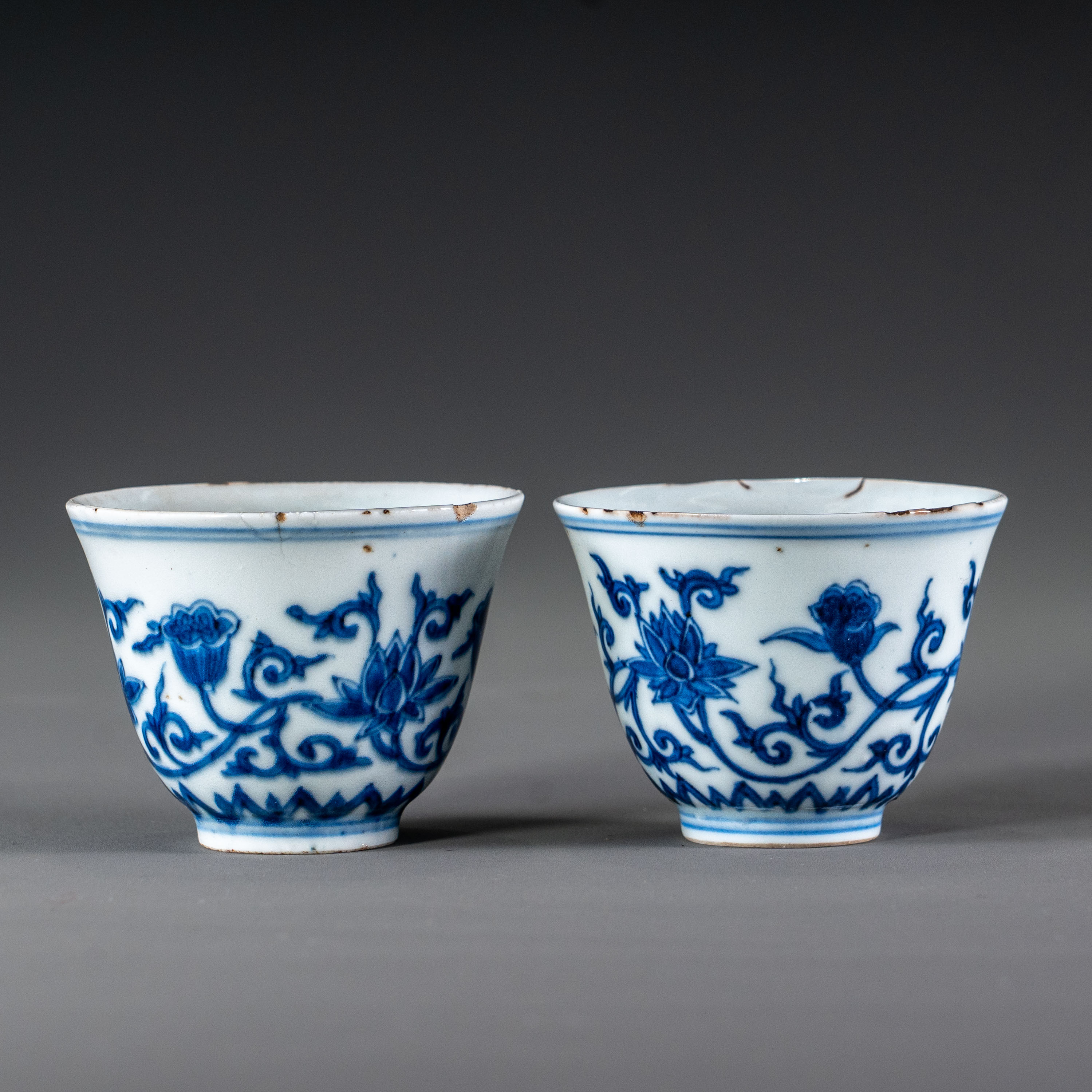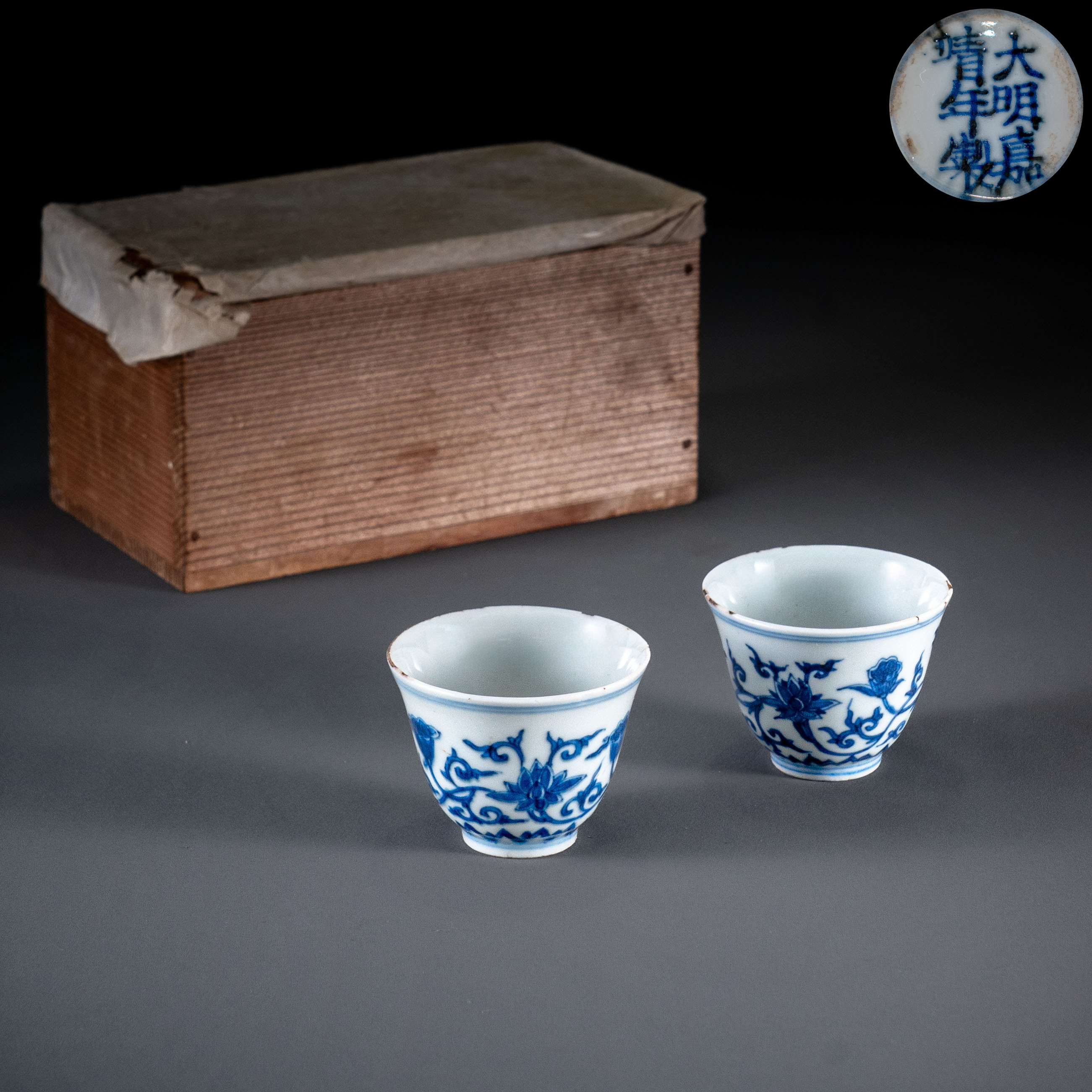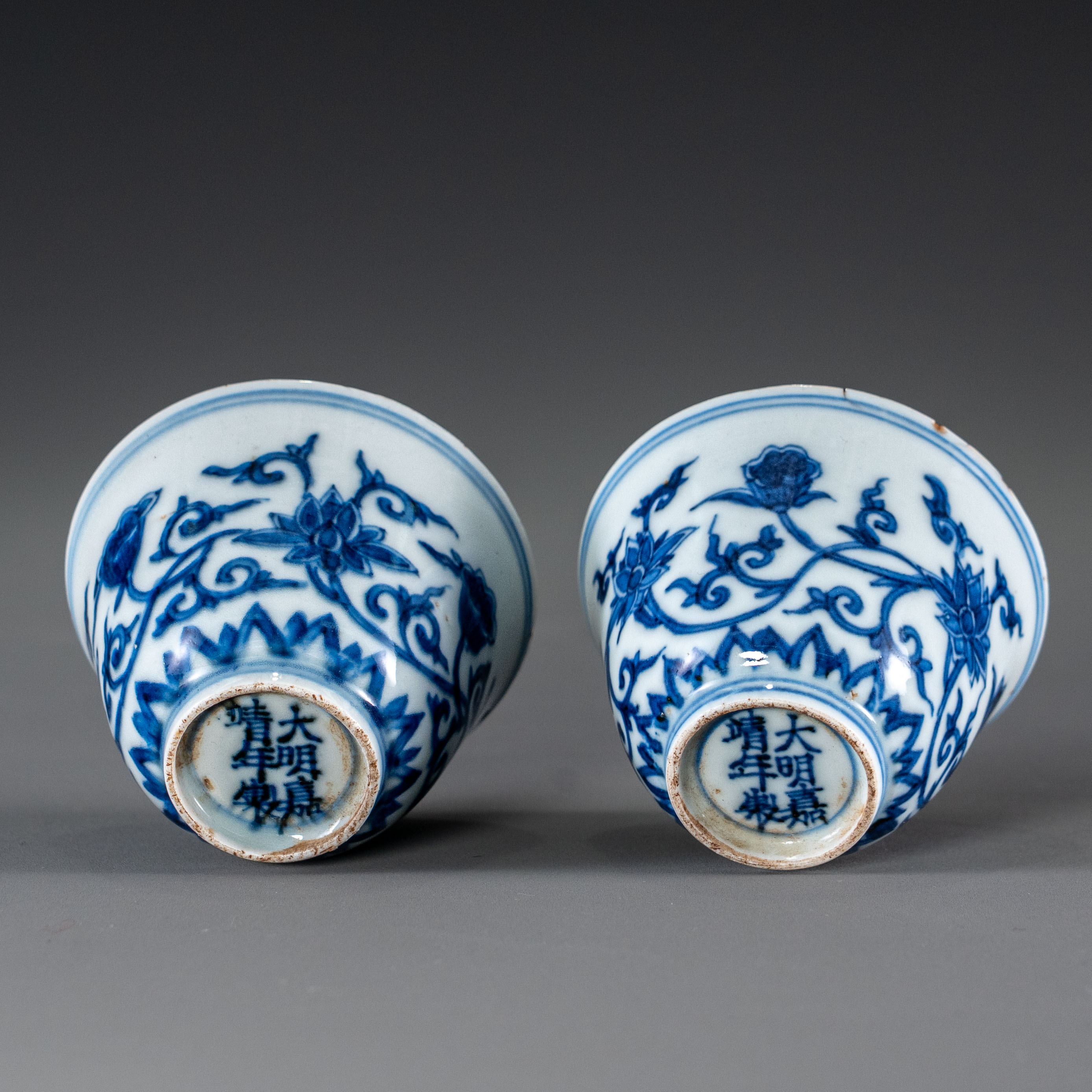 此对茶杯形制精巧,胎薄质坚,釉面莹润。器身以青花(染附)为饰,外壁满绘缠枝莲纹,线条流畅婉转,花朵俯仰有致,枝蔓连绵不断,寓意生生不息、清廉长久。青花发色浓郁鲜艳,具有嘉靖时期青花工艺的典型特征。